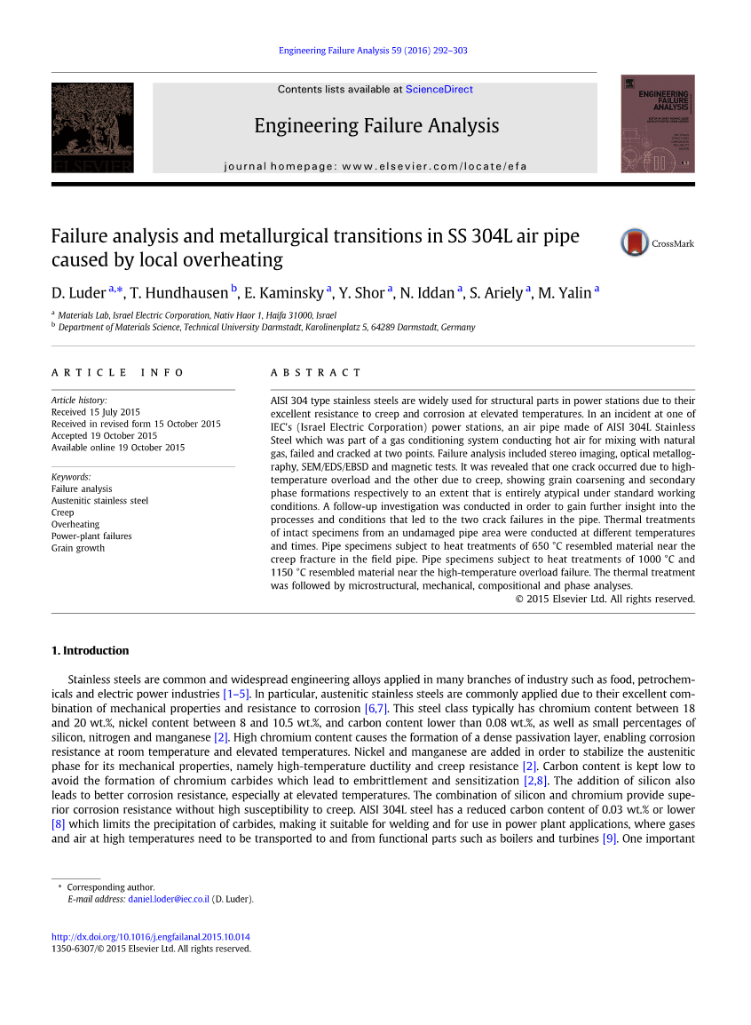 AISI304型不锈钢由于其出色的耐蠕变和耐高温腐蚀性能二被广泛应用于电站的部件。在IEC(以色列电力公司)发电站的一次事故中,由AISI304L不锈钢制成的N型空气管,是热风与天然气混合的气体调节系统的一部分,有两处发生了失效和破裂。失效分析包括立体成像、光学金相图、SEM/EDS/EBSD和磁测试。结果表明,在标准工况下,一处裂缝是由于高温过载形成的,另一处是由于蠕变形成的,在一定程度上可以表明出现了晶粒粗化和二次相的形成。为了进一步了解导致管道中两个裂纹形成的过程和条件,进行了后续调查。对未损坏的管道区域进行了不同温度和不同时长的热处理。对一样品进行650°C,接近管道发生蠕变破坏处的温度的热处理。对另外样品进行1000°C和1150°C,接近发生高温过载破坏处的温度的热处理。热处理后进行显微组织、机械性能、组分和相的分析。