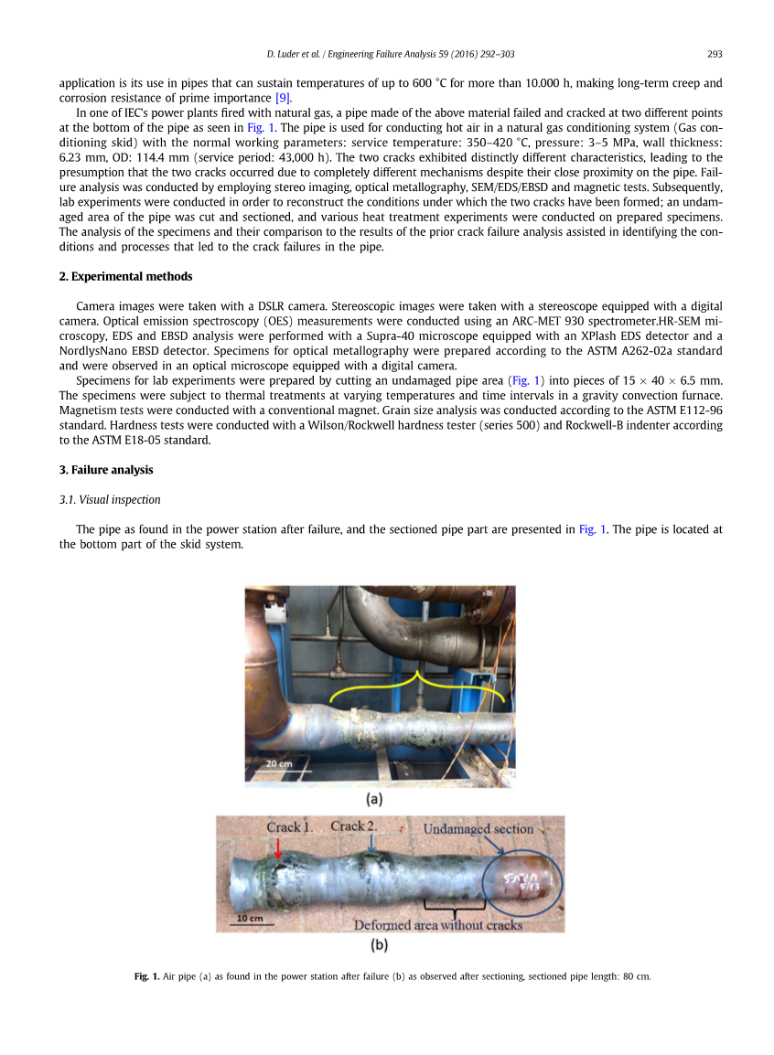 在IEC的一家用天然气燃烧的发电厂中,一根由上述材料制成的管道在管道底部的两个不同的地方发生了断裂,如图1所示。该管道用于在天然气调节系统(气体调节滑道)中传导热空气,其正常工作参数:工作温度:350~420°C,压力:3~5 MPa,壁厚:6.23mm,外径:114.4 mm(工作时长:43,000 h)。尽管这两种在管道上的位置很接近,但是它们表现出明显不同的特征,因此推测这两种裂纹的发生机理完全不同。采用立体成像、光学金相、SEM/EDS/EBSD(扫描电镜/色散谱/电子背散射衍射)和磁测等手段对管道裂纹进行了失效分析,并且在这之后为了重建这两种裂纹的形成条件进行了室内实验。 在此基础上,对管道的未老化区域进行了切割和切割,并在所制备的试件上进行了各种热处理试验。在管道的未老化区域进行了切割取样和制样,并对所制备好的试样上进行了各种热处理试验。对式样的分析和对先前裂纹失效分析结果的比较有助于认识裂纹失效发生的条件与过程。