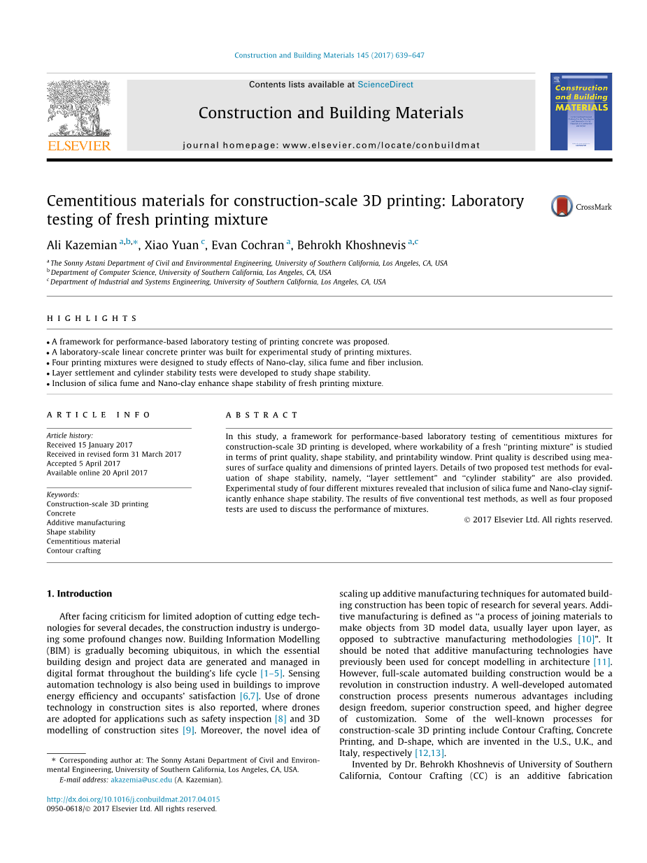 关键词:建筑规模3D打印;混凝土;添加剂制造;形状稳定性;胶凝材料;轮廓工艺。