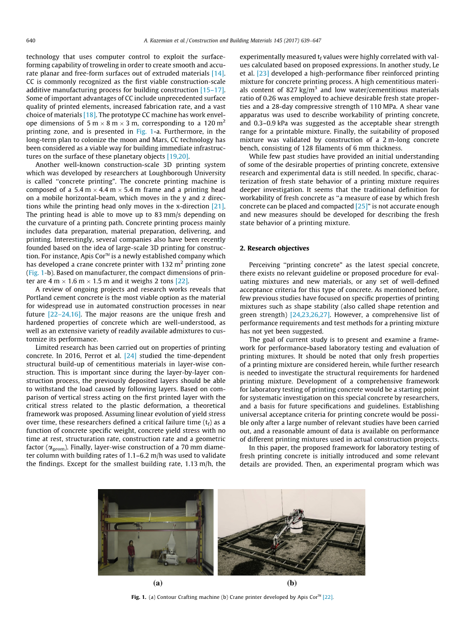 对正在进行的项目和研究工作的回顾表明,波特兰水泥混凝土作为近期自动化施工过程中广泛使用的材料是最可行的选择[22-24,16]。主要原因是混凝土独特的新鲜和硬化特性,以及各种易于使用的外加剂来定制其性能。对印刷混凝土的性能进行了有限的研究。 2016年,Perrot等人[24]研究了层状结构中水泥材料随时间变化的结构形成。这是重要的,因为在逐层构造过程中,先前沉积的层应该能够承受由后续层所引起的负载。基于作用于第一印刷层的垂直应力与塑性变形相关的临界应力的比较,提出了理论框架。假设随着时间的推移线性演化的屈服强度,这些研究人员将临界失效时间(tf)定义为混凝土特定重量,静止时没有时间的混凝土屈服应力,结构化率,施工率和几何因子(年龄)的函数。最后,使用建筑速率为1.1-6.2m / h的70mm直径塔的分层结构来验证结果。除最小建筑率,1.13m/h外,实验测量值tf与基于提出的表达式计算的值高度相关。在另一项研究中,Le et al。 [23]开发了一种用于混凝土印刷工艺的高性能纤维增强印刷混合物。采用827kg / m3的高胶凝材料含量和0.26的低水/胶凝材料比来实现理想的新鲜状态性质和28天的110MPa抗压强度。使用剪切叶片装置来描述印刷混凝土的可加工性,并且建议0.3-0.9kPa作为可印刷混合物的可接受的剪切强度范围。最后,建议的混合料的适用性通过建造一个2m长的混凝土工作台来验证,该工作台由128片6mm厚的薄片组成。