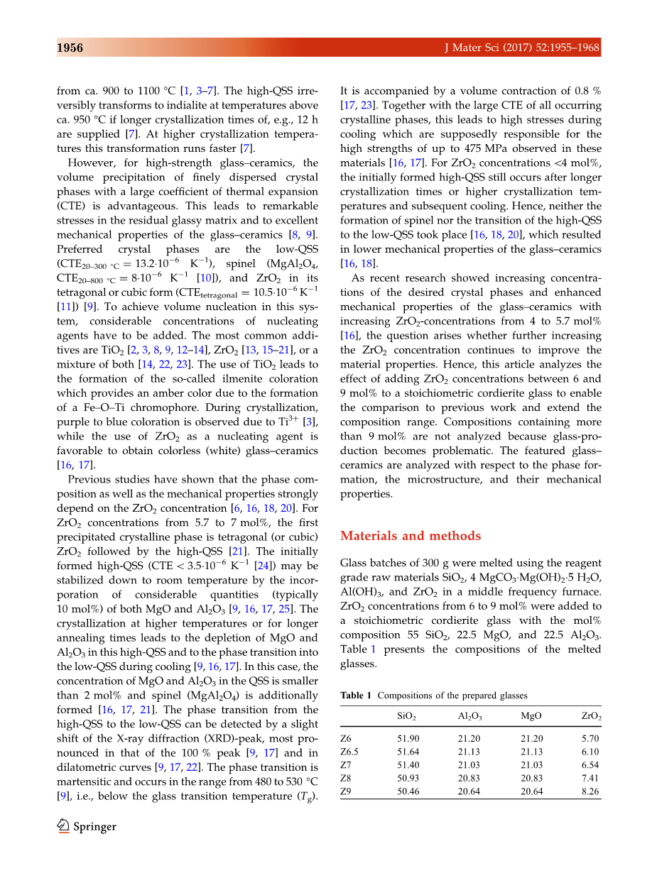 对于高强度微晶玻璃,具有大热膨胀系数(CTE)的细分散晶相的体积析出是有利的。这导致了残余玻璃基体中的显著应力和微晶玻璃的优良力学性能[8,9]。首选晶相为低QSS(CTE 20-300 C=13.210-6K-1),尖晶石(MgAl2O4,CTE 20-800 C=810-6K-1[10])和四方晶系或立方相(CTE四边形=10.510-6K-1[11])[9]。为了在该体系中实现体积成核,必须加入相当浓度的成核剂。最常见的添加剂是TiO2[2,3,8,9,12-14],ZrO2[13,15-21],或两者的混合物[14,22,23]。TiO2的使用导致了所谓的钛铁矿颜色的形成,这种颜色由于Fe-O-Ti发色团的形成而呈现琥珀色。在晶化过程中,由于Ti3 的影响[3],可以观察到从紫色到蓝色的着色,而使用ZrO2作为成核剂有利于获得无色(白色)微晶玻璃[16,17]。