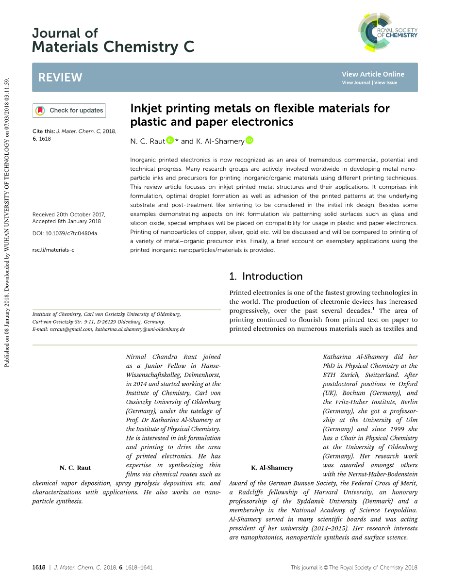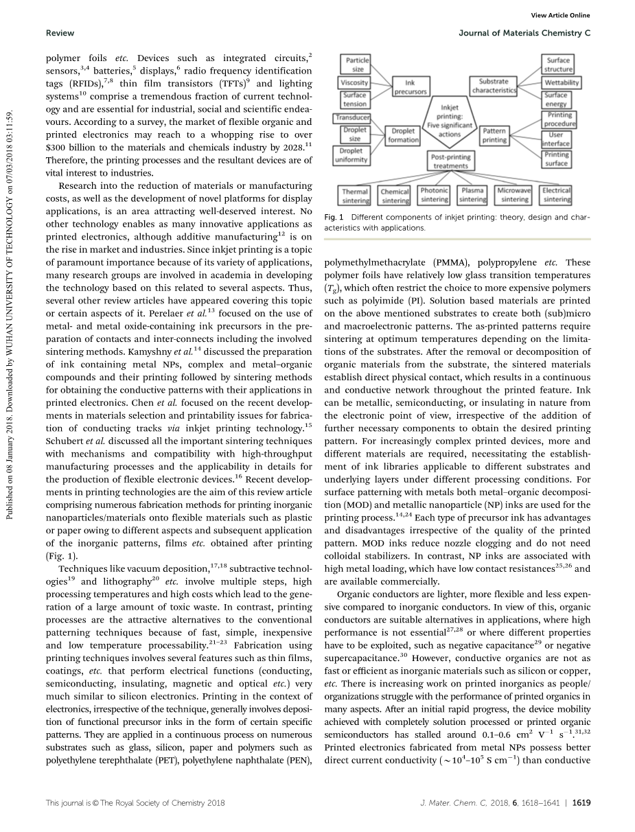 研究减少材料或制造成本,以及开发用于显示应用的新型平台,这一领域吸引了当之无愧的兴趣。尽管增材制造12在市场和行业中正在兴起,但没有其他技术能够实现与印刷电子产品一样多的创新应用。由于喷墨打印由于其多种应用而成为一个至关重要的话题,许多研究小组都参与了学术界在此基础上开发的技术,涉及多个方面。因此,其他几篇评论文章已经出现,涵盖了这个话题或其中的某些方面。 Perelaer等13着重介绍了使用含金属和金属氧化物的油墨前驱体在接触和互连的准备工作中,包括所涉及的烧结方法。 Kamyshny等14讨论了含有金属纳米粒子,复合物和金属有机化合物的油墨的制备及其印刷,然后通过烧结方法获得导电图案及其在印刷电子学中的应用。陈等人。重点关注通过喷墨印刷技术制作导电轨道材料选择和印刷适性问题方面的最新发展。Schubert等人讨论了所有重要的烧结技术,其中涉及高通量制造工艺的机制和兼容性以及柔性电子设备生产的详细应用.16最近在印刷技术方面的发展是这篇评论文章的目标,其中包括许多印刷制造方法无机纳米粒子/材料由于印刷后获得的无机图案,薄膜等的不同方面和随后的应用而在塑料或纸等柔性材料上。