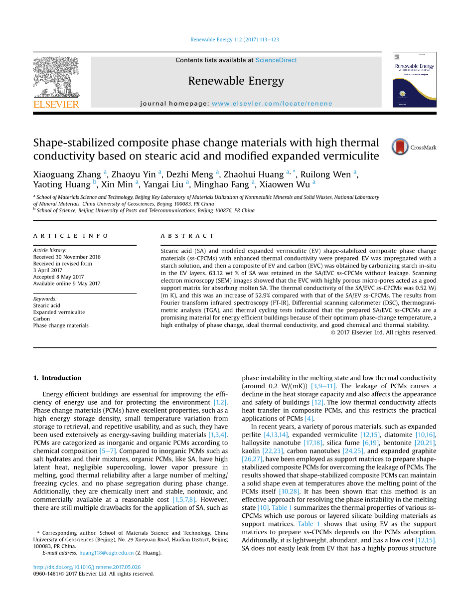 摘要:制备具有增强的导热性的硬脂酸(SA)和改性膨胀蛭石(EV)形状稳定的复合相变材料(ss-CPCM)。 EV用淀粉溶液浸渍,然后通过在EV层中原位碳化淀粉获得EV和碳的复合物(EVC)。在SA / EVC ss-CPCM中保留了63.12wt%的SA而没有泄漏。扫描电子显微镜(SEM)图像显示具有高度多孔微孔的EVC充当用于吸收熔融SA的良好载体基质。 SA / EVC ss-CPCM的热导率为0.52 W /(m K),比SA / EV ss-CPCM的热导率提高了52.9%。傅里叶变换红外光谱(FT-IR),差示扫描量热仪(DSC),热重分析(TGA)和热循环测试的结果表明制备的SA / EVC ss-CPCMs是用于节能建筑物的有前景的材料,因为它们的最佳相变温度,相变焓高,理想的热导率以及良好的化学和热稳定性。