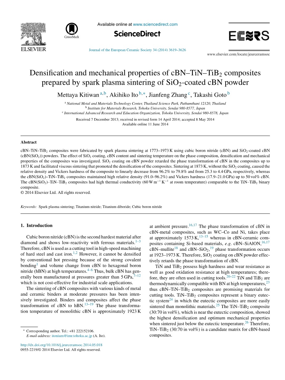 放电等离子烧结法烧结SiO2包覆的cBN 粉末制备cBN–TiN–TiB2复合材料的致密化和力学性能的研究