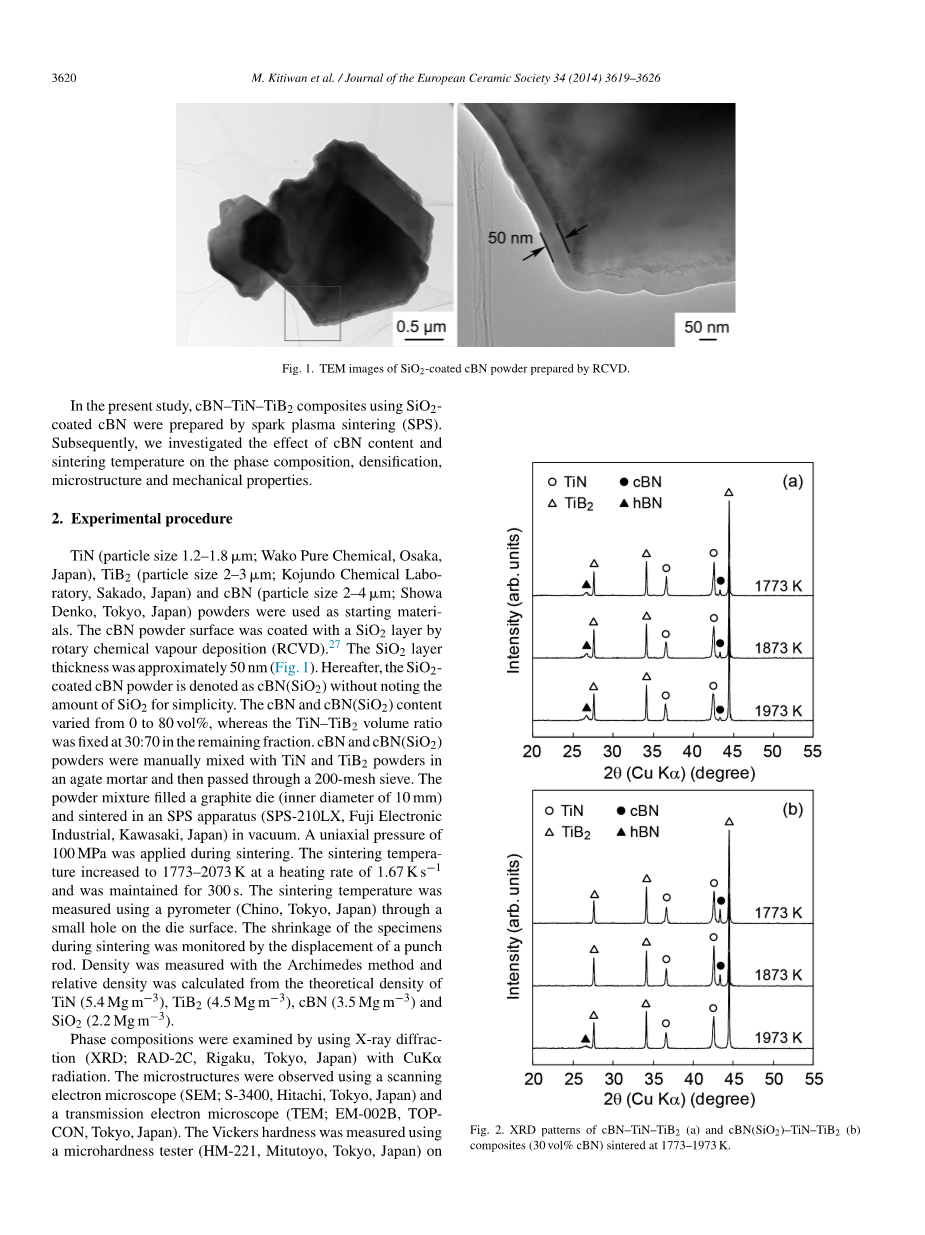 原料是TiN(颗粒尺寸1.2–1.8mu;m;瓦科纯化工,大阪,日本),TiB2(粒度2–3mu;m;Kojundo 化学实验室,Sakado,日本)和cBN (粒径2–4mu;m;昭和电工,东京,日本)微粉。采用旋转化学气相沉积法(RCVD)将SiO2包覆在cBN 微粉表面27。SiO2表面层厚度将近50nm (图 1)。为方便起见,后文将用cBN(SiO2)表示SiO2包覆的cBN微粉。cBN和cBN(SiO2)含量从0到80vol%不等,而在剩余部分中TiN-TiB 2体积比固定在30:70。将cBN和cBN(SiO2)粉末与TiN和TiB2粉末在玛瑙研钵中手动混合后通过200目筛。然后将粉末混合物填充在石墨模具(内径10mm)中,并在真空下在SPS设备(SPS-210LX,Fuji Electronic Industrial,Kawasaki,Japan)中烧结。在烧结过程中施加100MPa的单轴压力。烧结温度以1.67Ks-1的升温速率增加到1773-2073K,并保持300s。使用高温计(Chino,Tokyo,Japan)通过模具表面上的小孔测量烧结温度。烧结过程中通过冲杆的位移来监测样品的收缩。用阿基米德法测量密度,并根据TiN(5.4Mgm-3),TiB2(4.5Mgm-3),cBN(3.5Mgm-3)和SiO2(2.2Mgm-3)的理论密度计算相对密度。