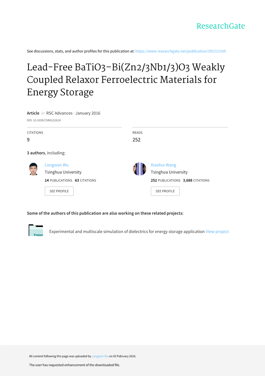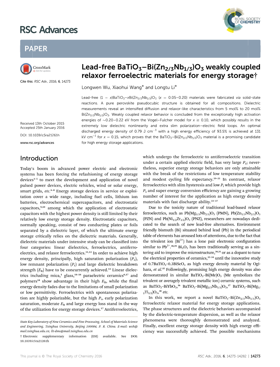 用于储能的无铅BaTiO3-Bi(Zn2 / 3Nb1 / 3)O3弱耦合弛豫铁电材料
