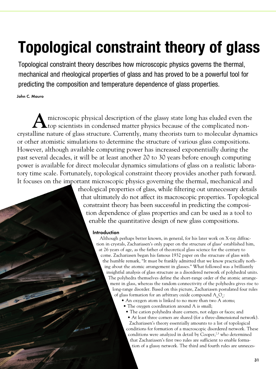 由于玻璃结构复杂的非晶态性质,即便是凝聚态物理学领域的顶尖科学家,也一直没有作出对玻璃态的微观物理描述。目前,许多理论学家们转向用分子动力学和原子模拟的方法去判定各种玻璃组分的结构。然而,虽然科研可使用的计算能力在过去几十年中取得了指数级的增长,但至少还需要20到30年的时间,才能在现实的实验室时间尺度上,得到足够的计算能力来进行玻璃的直接分子动力学模拟。幸运的是,拓扑约束理论提供了另一条研究路径。它专注于控制玻璃的热学、机械和流变学性质这些重要的微观物理学,同时过滤掉那些最终不会影响到其宏观性质的不必要的细节。拓扑约束理论已在预测玻璃性质的组成依赖性方面取得了成功,并且该理论可以被用作一个使定量设计新的玻璃组合成为可能的工具。
