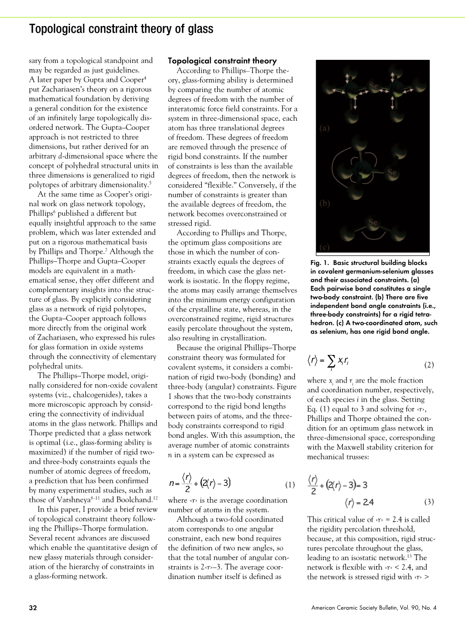 虽然一个双重协调原子相当于一个角度约束,但每个新键都需要定义两个新角度,使得角约束的总数是。平均配位数被定义为 (2),其中x和r分别是玻璃中每种物质的摩尔分数和配位数,使(1)等于3并求。Phillips和Thorpe 得到了在三维空间内最优玻璃网络结构的条件,与机械衍架的Maxwell稳定性准则相对应: