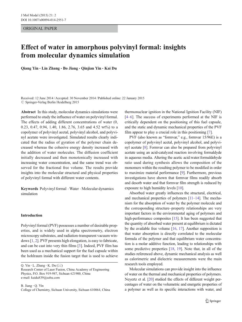 摘要在这项研究中,进行分子动力学模拟研究水对聚乙烯醇缩甲醛的影响。研究了添加不同浓度的水(0,0.23,0.47,0.94,1.40,1.86,2.76,3.65和4.52wt%)对聚乙烯醇缩醛,聚乙烯醇和聚乙酸乙烯酯的共聚物的影响。模拟结果清楚地表明,聚合物链的回转半径减小,而内聚能密度随着水分子的加入而增加。扩散系数最初降低,然后随着水浓度的增加而单调增加,对于自由体积分数观察到相同的趋势。结果提供了具有不同水含量的聚乙烯醇缩甲醛的分子结构和物理性质的见解。