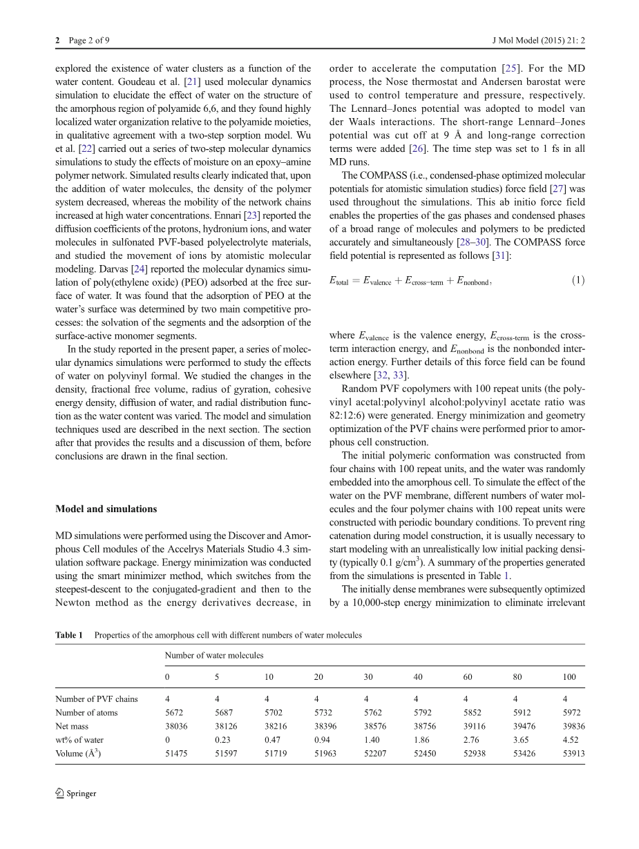 在本文报告的研究中,进行了一系列分子动力学模拟研究水对聚乙烯醇缩甲醛的影响。我们研究了密度,分数自由体积,回转半径,内聚能密度,水扩散和径向分布函数随水含量变化的变化。使用的模型和仿真技术在下一节中描述。之后的部分提供结果并对其进行讨论,然后在最后一节中得出结论。