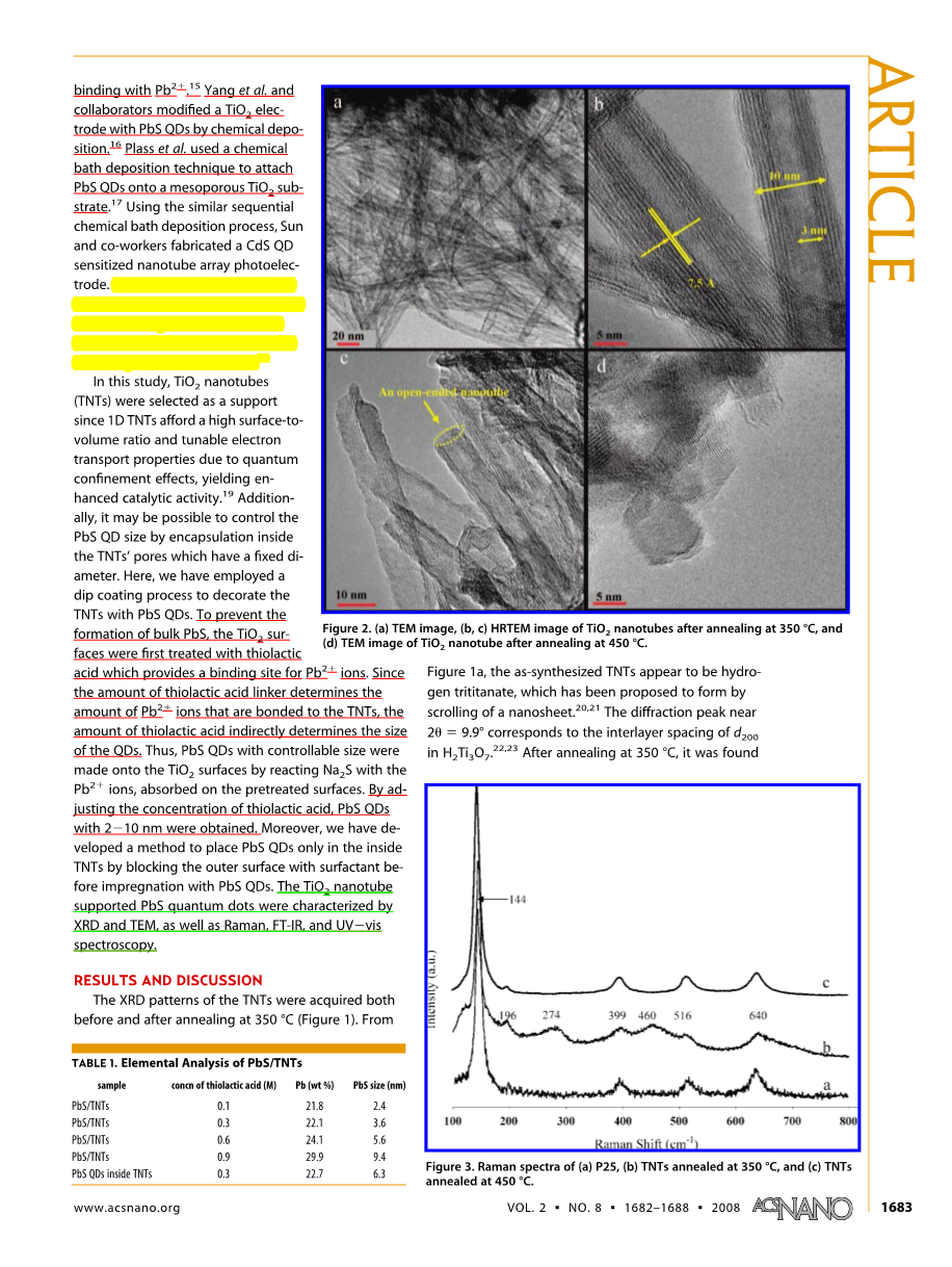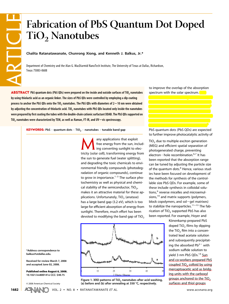 TiO2锐钛矿纳米管是通过TiO2(P25)热液过程在氢氧化钠存在的情况下后经酸洗制得。用PbS量子点修饰好的TiO2是使用硫代乳酸连接Pb2 离子与Na2S反应制得的。PbS量子点的大小被控制在2-10纳米,通过调节硫代乳酸的浓度控制。TiO2纳米管内表面PbS量子点的选择性沉积是通过使用(C12H25)2(CH3)2NBr来阻隔纳米管的外表面来制得的。密封的PbS量子点热处理导致了带有TNT结构的PbS纳米管的形成。这个令人惊讶的结果可以提供一种方法来制造其他半导体纳米棒。此外,随着TNT空隙被填充,其外表面能添加其他量子点或者薄膜而被功能化。这种纳米结构的合成正在飞速发展。