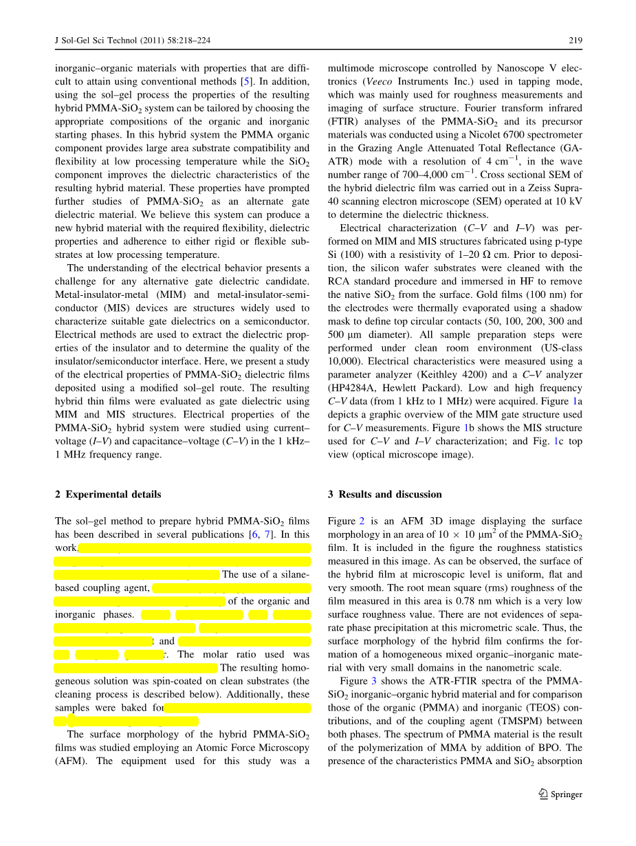 摘要:有机-无机杂化薄膜采用改进的溶胶-凝胶法制备。用正硅酸乙酯为无机(SiO2)源,用甲基丙烯酸甲酯(MMA)作为有机源,3-trimetoxysi-lylpropyl丙烯酸甲酯作为偶联剂。制薄膜的方法是在Si(100)p型玻璃基片上旋涂并在90摄氏度环境下热处理成型。傅立叶变幻红外光谱扫描显示了杂化薄膜中PMMA相和SiO2相的结构的吸收频带。电容-电压(C-V)特性测定是在金属-绝缘体-金属(MIM)和金属-绝缘体-半导体(MIS)构造物上展开的,杂化薄膜在其中当作绝缘体来评估其电性能。我们对在1 kHz–1MHz 的频段范围的C-V特性得出的介电常数提出了详细的比较分析。我们在1MHz上获得的PMMA-SiO2的介电常数值是9.5,优于报导中的热生长SiO2和纯PMMA的介电常数值。PMMA-SiO2的硅的界面态密度大约是1010cm-2 ,这比得上标准的SiO2/Si结构。由于他拥有良好的电特性,加工温度低,而且它的后续的实际生产并不需要复杂设备,这一杂化介质非常被看好成为灵敏电子元件的候选材料。