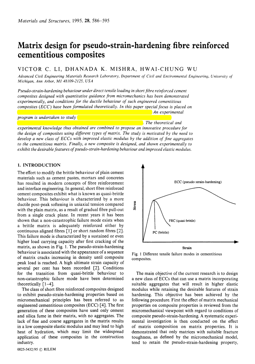玻璃短纤维增强复合材料设计是显示伪应变硬化性能的基础,在微观水泥力学中被称为工程水泥复合材料。第一次试验时,复合材料只使用水泥在他们的矩阵里,没有进行聚集。在结果中显示缺乏不同富集情况下的精细表现,在实际工程应用中可能会导致较高的水合热,由此限制了这种材料广泛的应用在施工当中。