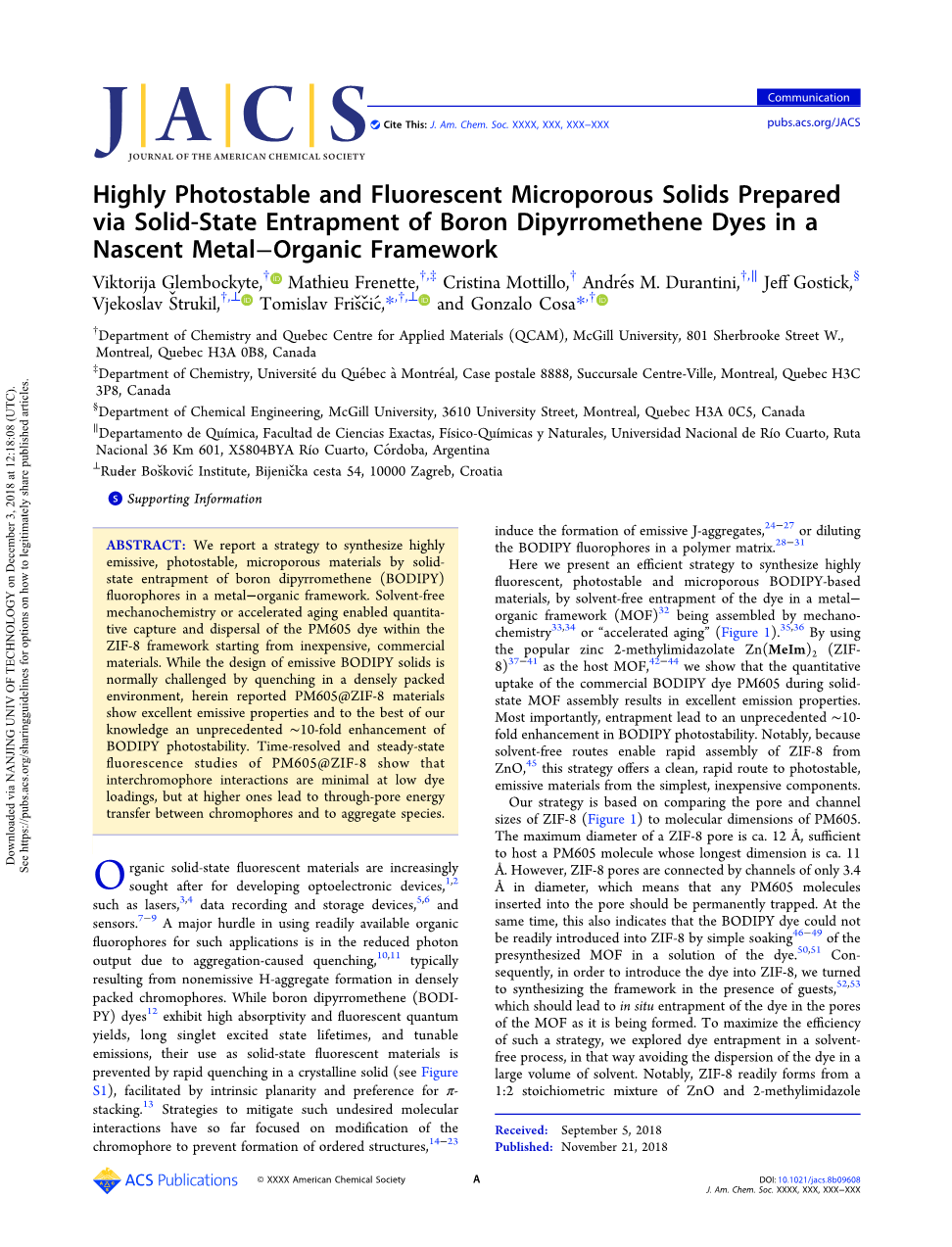 摘要:我们报道了一种利用二吡咯甲基硼(BODIPY)荧光团在金属-有机骨架中固相包封来合成高发射率、光稳定的微孔材料的方法。从廉价的商业材料开始,在ZIF-8框架内,无溶剂机械化学或加速老化能定量捕获和分散的PM605染料。虽然发射型BODIPY固体的设计通常会受到在密集环境中淬火的挑战,但在此报告的PM605@ZIF-8材料显示出优异的发射性能,据我们所知,对BODIPY光稳定性的提高达到了前所未有的约10倍。对PM605@ZIF-8的时间分辨和稳态荧光研究表明,在低染色负荷时,发色团相互作用最小,但在高染色负荷时,发色团之间的通孔能量转移和聚集物种。