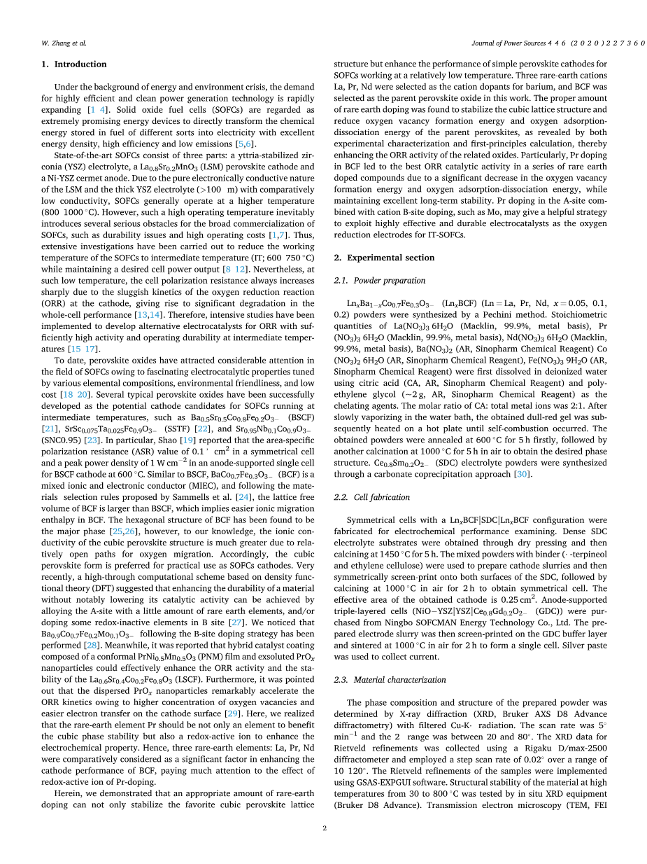 迄今为止,钙钛矿型氧化物因其具有经不同元素组成调节而展现出优异的电催化性能、环境友好型、低成本等特点,在SOFCs研究领域引起了人们广泛的关注[18-20]。目前已成功研制了几种可能作为中温SOFCs阴极材料的典型钙钛矿氧化物,诸如Ba0.5Sr0.5Co0.8Fe0.2O3-delta; (BSCF) [21],SrSc0.075Ta0.025Fe0.9O3-delta; (SSTF) [22],以及 Sr0.95Nb0.1Co0.9O3-delta; (SNC0.95) [23]。特别是Shao[19]等人研究发现,在600℃下,以BSCF作阴极材料,一种对称电池的面积比极化电阻(ASR)值为0.1Omega; cm2,另一阳极支撑型单电池的功率密度峰值达到了1Wcm-2。类似地,BaCo0.7Fe0.3O3-delta;(BCF)是一种混合离子电子导体(MIEC),遵循Sammells[24]等人提出的材料选择规则,BCF的晶格自由体积大于BSCF,具有更低的离子迁移焓。研究发现BCF的主相为六方结构[25,26],然而目前已知,立方钙钛矿结构的氧迁移路径相对开放,具有较高的离子电导率。因此,在实际应用中,SOFCs阴极首选采用立方钙钛矿结构材料。近期,一种基于密度泛函理论(DFT)的高通量算法表明,在A位掺杂微量稀土元素、在B位掺杂一定的无氧化还原活性元素并进行合金化处理,可以在不明显降低材料催化活性的基础上提升其耐久性[27]。目前已有遵循上述B位掺杂方式成功制备Ba0.9Co0.7Fe0.2Mo0.1O3-delta;的案例[28]。同时,还有研究发现,由保角形PrNi0.5Mn0.5O3 (PNM)薄膜和外溶体PrOx纳米颗粒组成的复合催化涂层可以有效提高ORR活性和La0.6Sr0.4Co0.2Fe0.8O3 (LSCF)的稳定性。此外,文章中还报道了分散的PrOx纳米粒子具有较高的氧空位浓度,阴极表面更容易发生电子转移,显著加速了ORR动力学的速率[29]。由此我们可以发现,稀土元素Pr不仅是有利于立方相的稳定性,而且可以作为提高电化学性能的氧化还原活性离子。因此,相比之下认为La、Pr、Nd三种稀土元素的掺入是提高BCF阴极材料性能的重要因素,特别是掺杂Pr元素作为氧化还原活性离子。