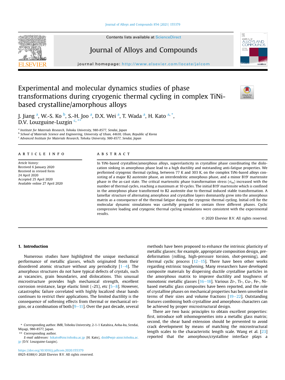 复杂Ti Ni基晶/非晶合金低温热循环相变的实验和分子动力学研究外文翻译资料