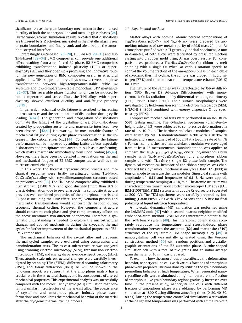 本文首先利用基于先前工作的晶体/非晶体结构的Ti40Ni39.5Cu8Zr10Co2Y0.5合金对热低温循环过程以及力学响应进行了研究。TiNi基复合合金具有较高的强度(2500MPa)和良好的延性(塑性变形大于20%),其复合结构提供了非晶基体和B2相的良好组合性能,包括TRIP效应。在低温热循环过程中,再生过程与马氏体相变同时发生。然而,复合结构应约束各相,并对上述两种不同现象产生互补作用。因此,为了进一步提高B2-BMG复合材料的力学性能,需要系统地了解其在低温热循环过程中的微观结构变化及其应用机理。