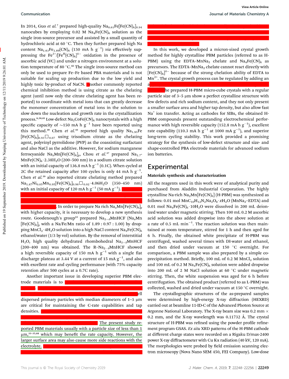 由于钠资源丰富,钠离子电池(SIBs)作为大规模固定式储能的潜在选择已引起广泛关注。开发高性能的电极材料对SIB技术的进展有极为关键重要性。钠过渡金属氧化物,聚阴离子化合物和普鲁士蓝类似物(PBAs)被广泛用作SIB的阴极材料。通式为NaxM[Fe(CN)6] y · nH2O(M=Mn,Fe,Co,Ni,Cu等)的PBA由于具有很高的理论容量(高达170 mAh g-1 ,带两个Na 存储),低成本,易于操作合成,有快速的Na 嵌入/脱出的开放框架结构的优势而备受关注。 在各种PBA中,亚铁氰化锰钠NaxMn [Fe(CN]6] y ·nH2O(称为PBM)被确定为用于SIB的最有前景的PBA阴极,因为它具有较高的工作电压和容量以及由此产生的能量密度。此外,锰元素在地球中含量很高且环境友好。但是,使用常规合成路线(即通过Mn2 和[Fe(CN)6]4-阴离子的简单共沉淀反应)制备的NaxMn [Fe(CN)6] y化合物通常显示出较差的循环稳定性,且初始容量低,晶体结构不完美。快速沉淀过程通常会在生成的PBM框架中导致[Fe(CN)6]4-空位,并且[Fe(CN)6] 4-空位被配位的H2O占据,这可能会阻碍Na 迁移并导致由于氰基桥联骨架的破坏而产生的较差的电子传导性,以至于反应动力学缓慢。此外,晶体结构中的高水含量可能会导致高于3.8 V发生不可逆的副反应,这会降低材料的库伦效率并导致Mn的损失,然后导致明显的容量下降。因此,合成一种具有高结晶度和低缺陷结构的富钠PBM,用于实现此类材料的实际应用非常重要。