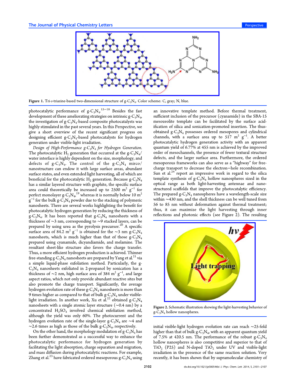 金属氧化物,如TiO2, SrTiO3等等,已经被广泛地研究用于光催化产氢,但是由于对太阳能的利用率低,因此它们并不是理想的半导体光催化剂。由于它们的带隙较宽,只在紫外光区域有光催化活性。一些其他的氧化物,包括WO3, BiVO4等等,是可见光响应的。但是由于它们的导带比水的还原电势低,因此不能催化水还原产生H2。CdS也曾被考虑,并且确实拥有窄的带隙和适于水分解的能带能级,然而,它是有毒的,并且由于存在光腐蚀和自氧化而通常不稳定。近年来,由于2009年Wang等人的g-C3N4在可见光下光催化分解水的开创性的研究,石墨型氮化碳(g-C3N4)已经受到了人们的特别关注。室温条件下,g-C3N4 被认为是各种类型氮化碳中最稳定的一种。g-C3N4被大家所接受的结构是通过叔胺连接的3-s-三嗪环所组成的二维结构(见图1),这使得它有高的热稳定性(空气中加热到600℃)和化学稳定性(耐酸、碱和有机溶剂)。它被认为是具有可见光活性的高分子半导体,带隙为2.7eV,相应的光学波长为460nm,对于水的分解具有合适的能带结构。就本身而言,g-C3N4迅速地成为了光催化领域的一颗闪耀明星。