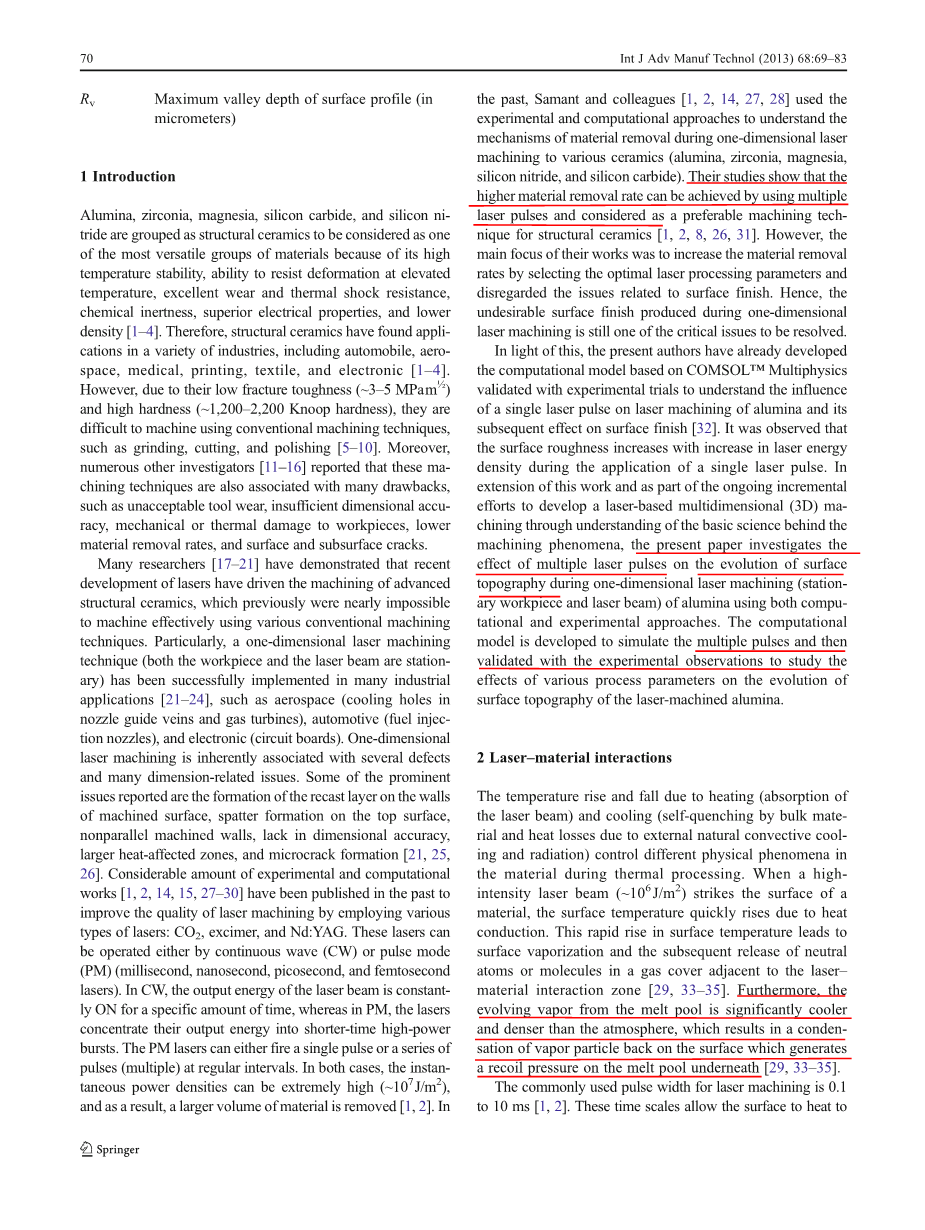 鉴于此,现在的作者们已经优化了基于COMSOLtrade; Multiphysics的经实验验证的计算模型来理解单一激光脉冲在氧化铝的激光加工上的影响及其对于表面光洁度的后续影响。可以观察到使用单一激光脉冲时表面粗糙度随着激光能量密度的增加而增加。作为这个工作延伸的一部分以及通过理解加工现象背后的基础科学发展基于激光的多维(3D)加工的持续增加的一部分,现阶段的论文研究了在同时使用计算和实验的方法对氧化铝进行一维激光加工(工件和激光束固定)的情况下多重激光脉冲对于表面形态发展的影响。计算模型被研制出用于模拟多重激光然后通过实验观察验证并借此研究多种工艺参数对于激光加工氧化铝表面形态的发展的影响。