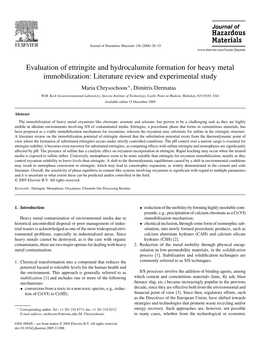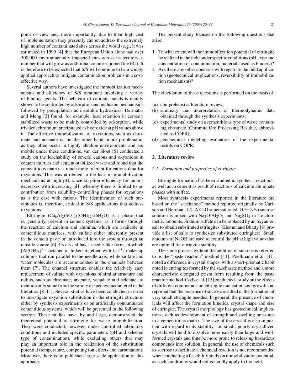 钙矾石(Ca6Al2(SO4)3(OH)12·26H2O)是一种通常存在于水泥系统中的相,其形成是通过钙和氧化铝的反应,这可以在水泥基体中获得,用硫酸或者固有存在水泥膏或通过外源[6]引入系统。其晶体具有针状形式,其中的[Al(OH)6]3-四面体,与Ca2 相连,构成该平行于针的轴线,而硫酸盐和水分子被容纳在它们之间的渠道[7]。渠道结构能够比较容易替换与硫酸盐具有相似的结构和半径的氧离子,如铬,砷,钒和硒,只提一些从各种文献中遇到的物质[8–11]。一些研究为了研究含氧阴离子置换的钙矾石结构,无论是由合成实验或已经进行人工污染水泥系统,下文将对此作出说明。这些研究总的来说证明了钙矾石的固化潜力的理论。然而,他们进行的是受控的实验室条件与包含特定参数(pH值和选定的污染的类型),而排除了其他可能发挥重要的作用的因素(温度,竞争离子效应和碳化)。此外,这种方法还没有公开的大规模应用。
