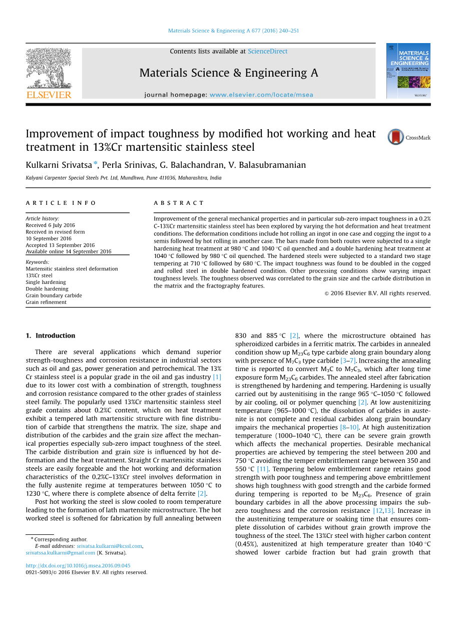 在石油和天然气,发电和石化等工业部门方面的应用,要求材料具有优异的强度韧性和耐腐蚀性。13%Cr不锈钢由于成本较低,与其他等级的不锈钢相比,在强度,韧性和耐腐蚀性方面的综合性能优异,因此在石油和天然气工业中受欢迎[1]。普遍使用的13%Cr马氏体不锈钢含有约0.2%的C含量,其在热处理时生成具有加强基体的碳化物,分布均匀的回火板条马氏体结构。 碳化物的尺寸,形状和分布以及晶粒尺寸影响钢的机械性能,特别是温度在零下时的冲击韧性。 碳化物分布和晶粒尺寸受热变形和热处理的影响。 直链Cr马氏体不锈钢易于锻造,0.2%C-13%Cr钢的热加工和变形特性涉及温度在1050℃至1230℃之间的完全奥氏体化变形,其中完全不存在delta; 铁素体[2]。
