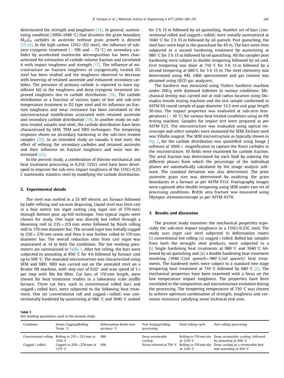 在对钒6工具钢进行了扩展研究后,确定了二次碳化物和残留奥氏体的精细化效果及其对断裂韧性和磨损的影响[21]。在本研究中,已经结合了对0.2%C-13%Cr钢的机械加工和热处理加工的组合,来通过修改碳化物分布来改善13%Cr-0.2%C马氏体不锈钢冲击韧性 。
