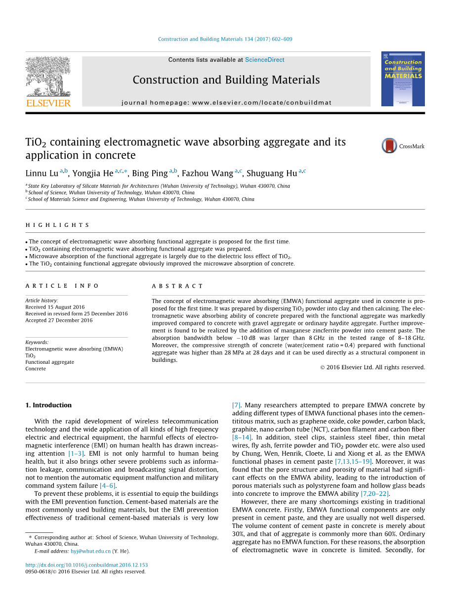 摘要:首次提出了混凝土中使用的电磁波吸收(EMWA)功能骨料的概念。通过将TiO2 粉末分散到粘土中然后煅烧来制备。与具有砾石骨料或普通陶粒骨料的混凝土相比,用功能骨料制备的混凝土的电磁波吸收能力显着提高。通过在水泥浆中加入锰锌铁氧体粉末可以实现进一步的改进。在8-18 GHz的测试范围内,低于-10 dB的吸收带宽大于8 GHz。此外,用功能骨料制备的混凝土抗压强度(水/水泥比= 0.4)在28天时高于28MPa,可直接用作建筑物的结构构件。