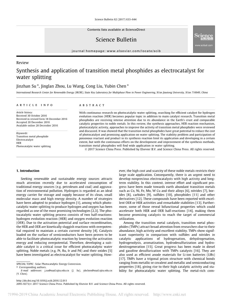 寻找可再生可持续能源最近吸引大量注意,因为传统能源(如石油和煤)消耗越来越快,环境污染越来越严重。氢气被认为是理想的用于储存和输运的能量载体,因为它清洁,相对分子质量小,能量密度高。人们已经采取一些方法来生产氢气,在这些方法中,光催化水解产氢被视作是最有前景的技术之一。光催化水解过程包括两个半反应,析氢反应(HER),和析氧反应(OER)。由于活化势和表面重结合,HER和OER都是动力学上极慢的反应,需要过电势来维持一个特定的电流密度。半导体表面上负载的催化剂已被证明能够通过降低活化能和降低过电势来促进光催化反应。所以,开发一个合适的催化剂,对于高效光催化水解,是一个重要的问题。贵金属(如铂,钌,铱和铅)以及它们的氧化物经研究发现是水解的电催化剂,但是,这些贵金属的高成本和稀缺度限制了它们的大规模应用。所以,现在急需开发廉价的具有高活性和长期稳定性的电催化剂。在这样的背景下,人们对地壳富含的过度金属如钴,镊,铁,钼,钨,铜以及它们的合金,氮化物,硼化物,碳化物,硫化物,磷化物以及其他衍生物进行了极为努力的研究并取得显著的进步。据报道,这些化合物有着极好的OER和HER活性以及显著的稳定性。并且,这些物质中有的展现出双功能性质,既能加速HER也能加速OER半反应,这使它们成为很有前景的催化剂,有望达到商业化利用。