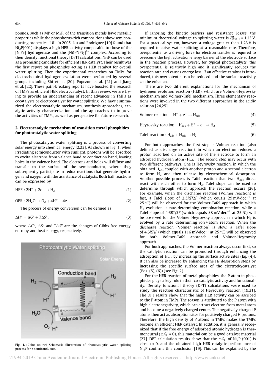 在过渡金属催化剂中,过渡金属磷化物吸引了研究人员的广泛注意,因为它们储量丰富,活性高,稳定性好。过渡金属磷化物与硫化物,氮化物相比,在氢化,去氢化,氢解,芳构化,加氢去硫化,加氢去氮化上,表现出显著优越性。人们已经在利用TMPs对柴油和汽油去硫上取得了很大进展。它们同时也被用作锂离子电池的高效阳极材料。TMPs有三棱柱的结构,化学键的性质范围从金属或共价到金属到半导体变化,这导致它们在光解水上有高的催化活性和稳定性。过渡金属的富金属化合物,比如MP或M2P,有金属性质,而富磷化合物表现出半导体性质。在2005年,liu和rodriguez发现Ni2P的(001)面表现出高的HER活性,堪比【NIFe】氢化酶和[Ni(PNP)2]2 复合物。根据它们的密度函数理论计算,Ni2P可以被用作高效HER催化剂的有前景的替代物。这些结果是有关磷化物用作HER催化剂来电解水的第一报道。然后一些小组,包括Shi等,Popczun等,和Jiang等进行了电化学产氢TMPs的实验研究。这些具有突破性的报告已经激发了高效HER电催化TMPs的研究。在这篇回顾中,我们试图给出一种对TMPs用做共催化剂或电催化剂水解的理解。我们已经总结了电催化的机理,合成途径,催化活性特点,以及提高TMPs活性的办法,同时也包括未来研究的前景。