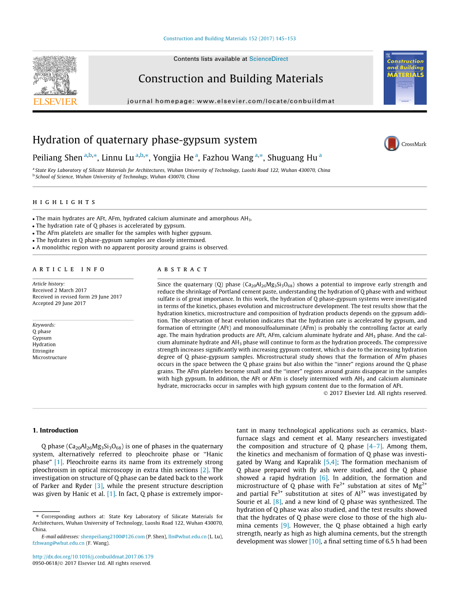 Q相(Ca20Al26Mg3Si3O68)是四元体系中的一种相态,或者称为多色相(Pleochroite)或“哈尼克(Hanic)相”。 多色相(Pleochroite)的名字来源于其超薄光学显微镜下极其强烈的多色性。对Q阶段结构的研究可以追溯到Parker和Ryder的工作,而目前的结构描述由Hanic等人给出。实际上,Q相在许多技术应用中非常重要,例如陶瓷,高炉炉渣和水泥等。 许多研究人员调查了Q相的组成和结构。其中,Q相的形成动力学和机理由Wang和Kapralik研究;研究了粉煤灰制备Q相的形成机理以及Q相快速水化。此外,Sourie等人通过Fe2 取代Q相中Mg2 位置,Fe3 取代Q相中Al3 位置的方法研究Q相的形成和微观结构,并合成了一种新的Q相。还研究了Q相的水化作用,研究结果表明Q相的水化产物与高铝水泥的水化产物成分十分接近。然而,Q相有着更高的早期强度,几乎与高铝水泥一样,但强度发展较慢,终凝时间为6.5个小时。Meng等人报道称含有Q相的砂浆抗压强度随龄期持续增加,并且在28天时可以获得60.94MPa的高抗压强度值。Kaprilik在室温下研究了Q相 - 水系统的抗压强度,在1天时获得了相当高的早期强度(27.93 MPa)