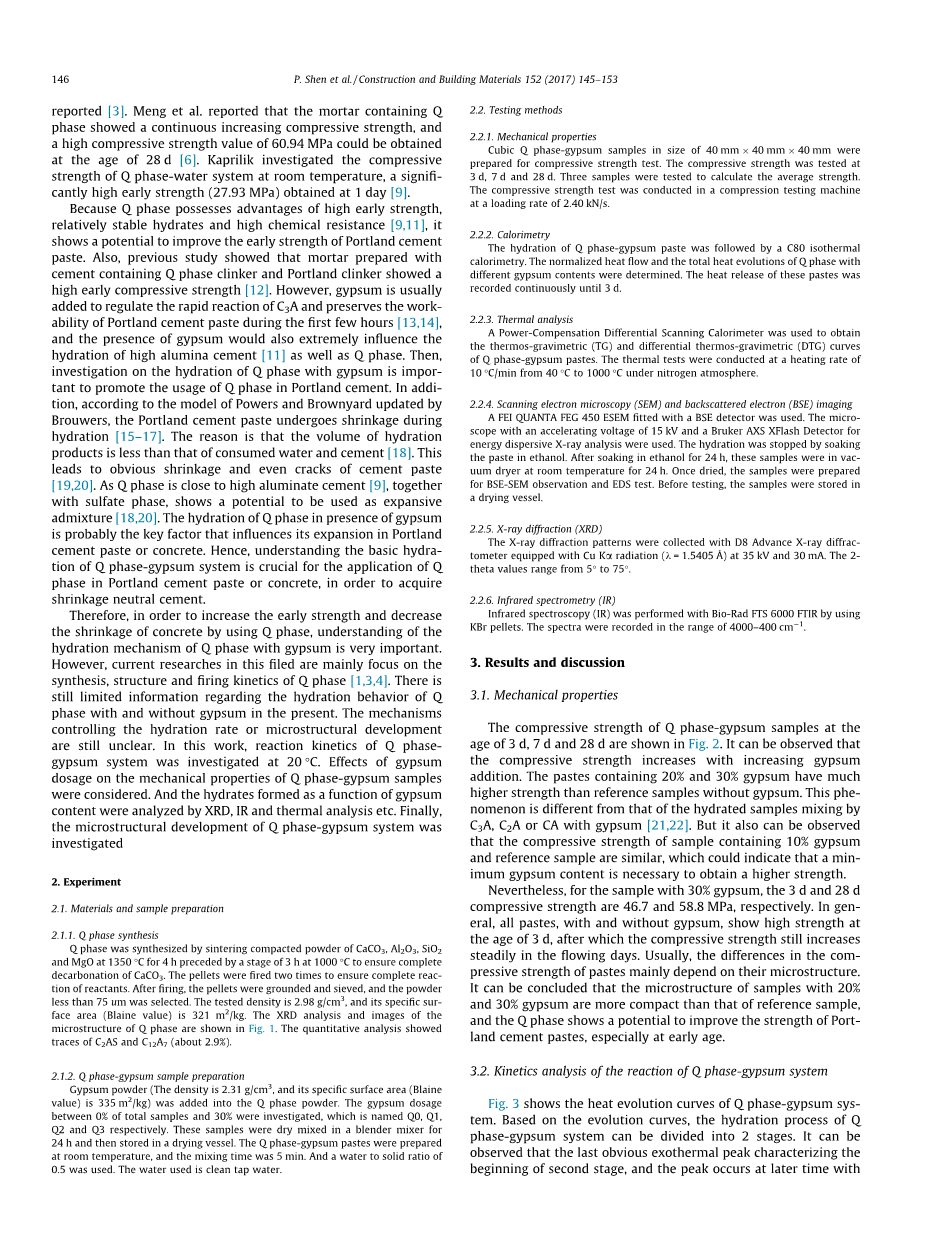 因此,为了通过掺入Q相提高混凝土的早期强度并减少收缩,了解Q相与石膏的水化机理非常重要。 然而,目前该领域的研究主要集中在Q相的合成,结构和反映动力学(firing kinetics)[1,3,4]。对于有没有石膏的Q相的水化过程的研究,信息仍然有限。控制水化速率或微观结构发展的机制仍不清楚。在本次研究中,对Q相-石膏体系的反应动力学在20℃条件下进行了研究。研究了石膏用量对Q相-石膏系统样品力学性能的影响。 通过XRD,IR和热分析等方法对掺入石膏后形成的水化产物进行了分析。最后,研究了Q相-石膏体系的微观结构发展。