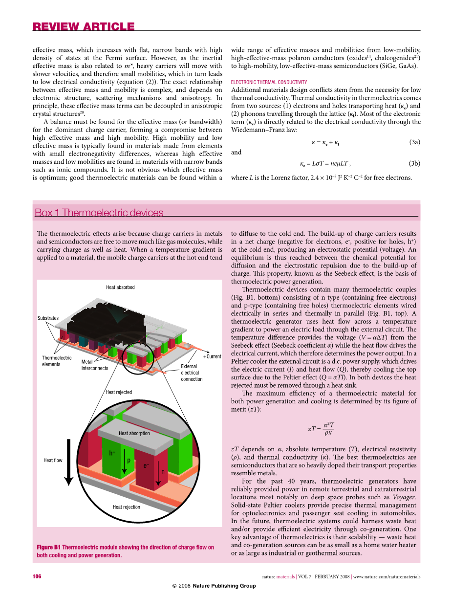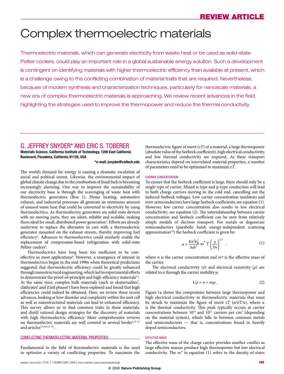 在大多数应用中,热电装置长期效率太低而不具备成本效益。然而,对热电兴趣的兴起始于20世纪90年代中期,当时的理论预测认为,通过纳米结构工程,可以大大提高热电效率,这就导致了通过实验方法来寻求其规律以及高效材料的证据。与此同时,对复杂的块状材料(例如,skathudites、笼形化合物和Zintl相)进行了探索,人们发现确实可以获得高效率。在这里,我们回顾这些最新进展,研究单位晶胞内的无序和复杂性以及纳米结构材料如何来提高效率。这项调查使我们能够找到这些材料的共同特征,并且提出合理的设计策略,用以发现具有高热电效率的材料。关于热电材料的更全面评述在若干书籍[1,10–12]和若干文章[3,5,6,8,13–18]之中都有很好的论述。