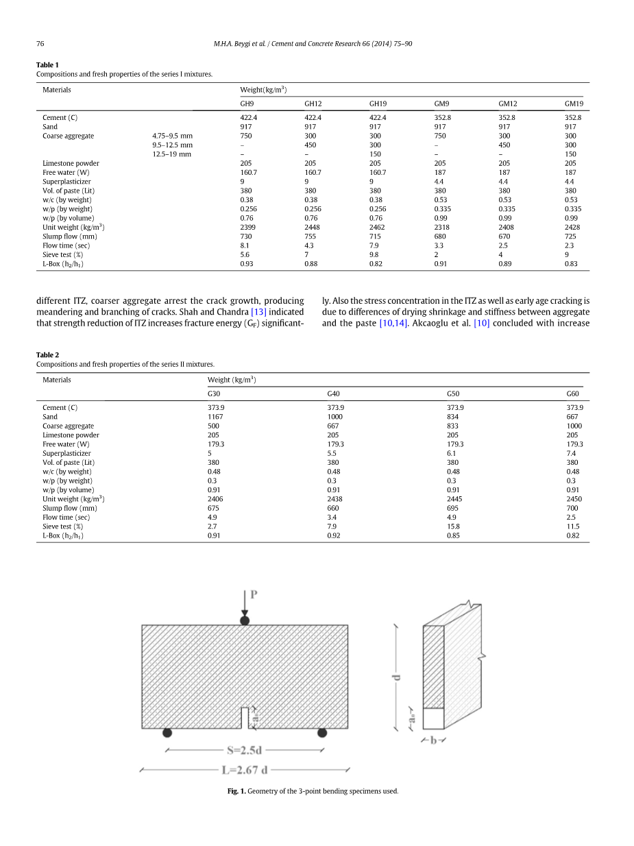 。SCC具有很高的可加工性,同时可防止浇注过程中的泌水和偏析。显然,它比普通振捣混凝土(NVC)具有环境、技术和经济效益,如加速施工过程、减少人力和提高耐久性。除了研究兴趣外,由于混凝土技术的革命性变化,SCC在建筑行业的应用也有所增加。研究人员主要关注的是,与NVC相比,SCC可能具有不同的行为,这是由于使用了相对较高含量的细颗粒,以避免新混合料中的离析。与NVC相比,这些混合物成分的差异可导致孔结构、机械性能,尤其是断裂响应的变化,从而导致SCC的开裂模式发生变化。应注意的是,混凝土作为一种准脆性材料,其断裂行为是工程结构特别是大型构件分析和设计中应考虑的一个重要方面。此外,应力腐蚀开裂行为直接影响混凝土结构的耐久性,这是目前施工领域的一个主要关注点。研究人员报告说,降低混凝土中的集料含量可能会降低集料桥接和裂缝间的连锁作用,从而降低能量吸收。另一方面,最近的研究表明,含石灰石粉的SCC混合料作为矿物添加剂,具有较大的自收缩性,因而具有较高的开裂倾向。尽管如此,许多研究报告称,使用石灰石粉等超细颗粒可使SCC基质更加致密,从而可改善集料和膏体之间的界面过渡区(ITZ)。ITZ的改进可能导致混凝土更易碎。这是因为,尽管沿着裂纹路径的材料承载力增加,但该路径通过集料并减少联锁。研究SCC的断裂行为,提高ITZ的强度和质量是需要考虑的主要因素。另一方面,ITZ的性质在很大程度上取决于集料的尺寸、体积、形状、表面结构等性质。Giaccio和Zerbino报道,集料的强度、尺寸、形状和表面结构对ITZ有着深刻的影响,并影响混凝土的开裂程度。此外,ITZ中的应力集中以及早期开裂是由于集料和糊料之间的干燥收缩和刚度差异造成的。Akcaoglu等人随着最大集料粒径(dmax)的增加,ITZ变得至关重要。Giaccio等人得出的结论是,粗集料的尺寸和类型对混凝土断裂性能的影响比其他添加剂(如稻壳灰)更大。考虑水灰比、最大集料粒径等多种混合料参数,许多作者对NVC的断裂行为进行了研究。由于集料几乎总是占混凝土体积的60-70%,因此它们对新浇和硬化混凝土的性能有着明显的控制作用。Hillerborg[17]分析了dmax对gf的影响,指出gf随dmax的增加而增加。Mihashi等人、Walsh[20]、Bazant和Oh[21]、Zhao等人报告了同样的趋势。[22]以及Trunk和Wittmann,他们在gf和dmax之间引入了一个幂函数。伊萨等[6]观察到gf随dmax的增加单调增加。F.P. Zhou等[24]对不同dmax值对高强混凝土断裂性能的影响进行了系统测试。他们报告说,gf随着dmax的增加而增加。然而,一些研究人员报告了相反的趋势。B.I.G. Barr [25]和Wolinski等人[26]得出的结论是,dmax对断裂韧性值没有单调效应。彼得森[16]报道,gf不依赖dmax,但特征长度lch随dmax的增加而增加。M.D. Moseley [27]表明,随着集料粒径的增大,NVC表现出更多的延性行为。A. Yan[28]指明随着dmax的增加,NVC的分形维数大大提高。Gopalaratnam和Shah[29]和Akcay等人[30]指明,集料体积影响NVC的断裂力学参数。N.Q. Feng等 [31]得出结论,gf随粗集料体积的增加而单调增加。B. Chen, J. Liu [32]发现粗集料的体积和尺寸影响了NVC的FPZ。Amparano等人[18]指出,当集料体积增加时,FPZ的尺寸减小。