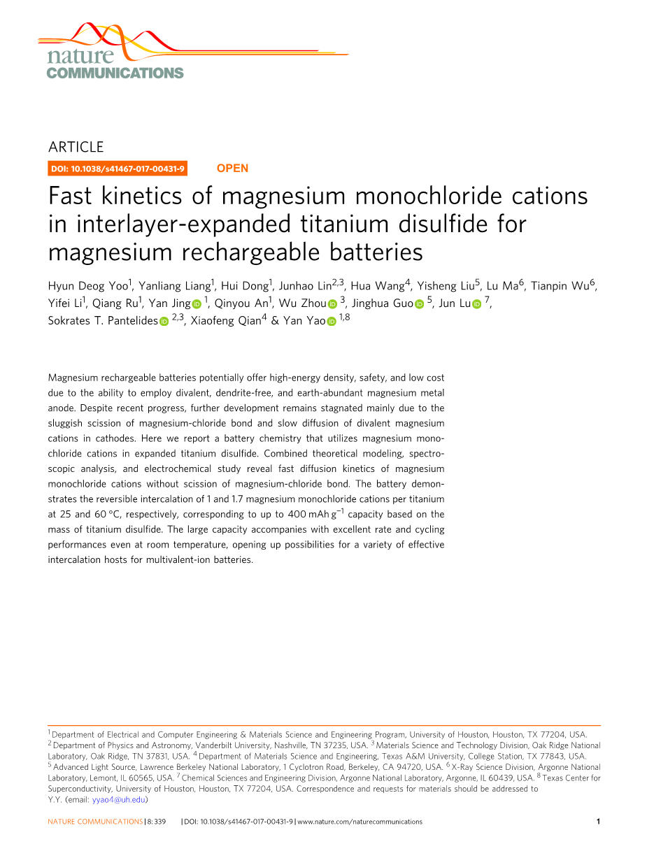 摘要:由于二价,无枝晶和大储量的镁金属资源,使可充电镁离子电池具有更高能量密度,安全性和低成本。尽管最近取得了一定进展,但进一步的发展仍然停滞不前,这主要是由于氯镁键的断裂缓慢以及正极中二价镁阳离子的缓慢扩散。在本文中,我们报道了一种化学电池,它利用一氯化镁阳离子在扩展层间距的层状二硫化钛中嵌入脱出。综合理论建模,光谱分析和电化学研究揭示了一氯化镁阳离子的快速扩散动力学,其中没有氯镁键的断裂。在25℃和60℃下电池显示出每个钛能分别地与1和1.7个一氯化镁阳离子进行可逆嵌入,相当于在基于二硫化钛质量时的容量能高达400mAh g-1。即使在室温下,其大容量的同时也具有优异的速率和循环性能,这为探索多价离子电池的各种有效的插层宿主材料提供了可能性。