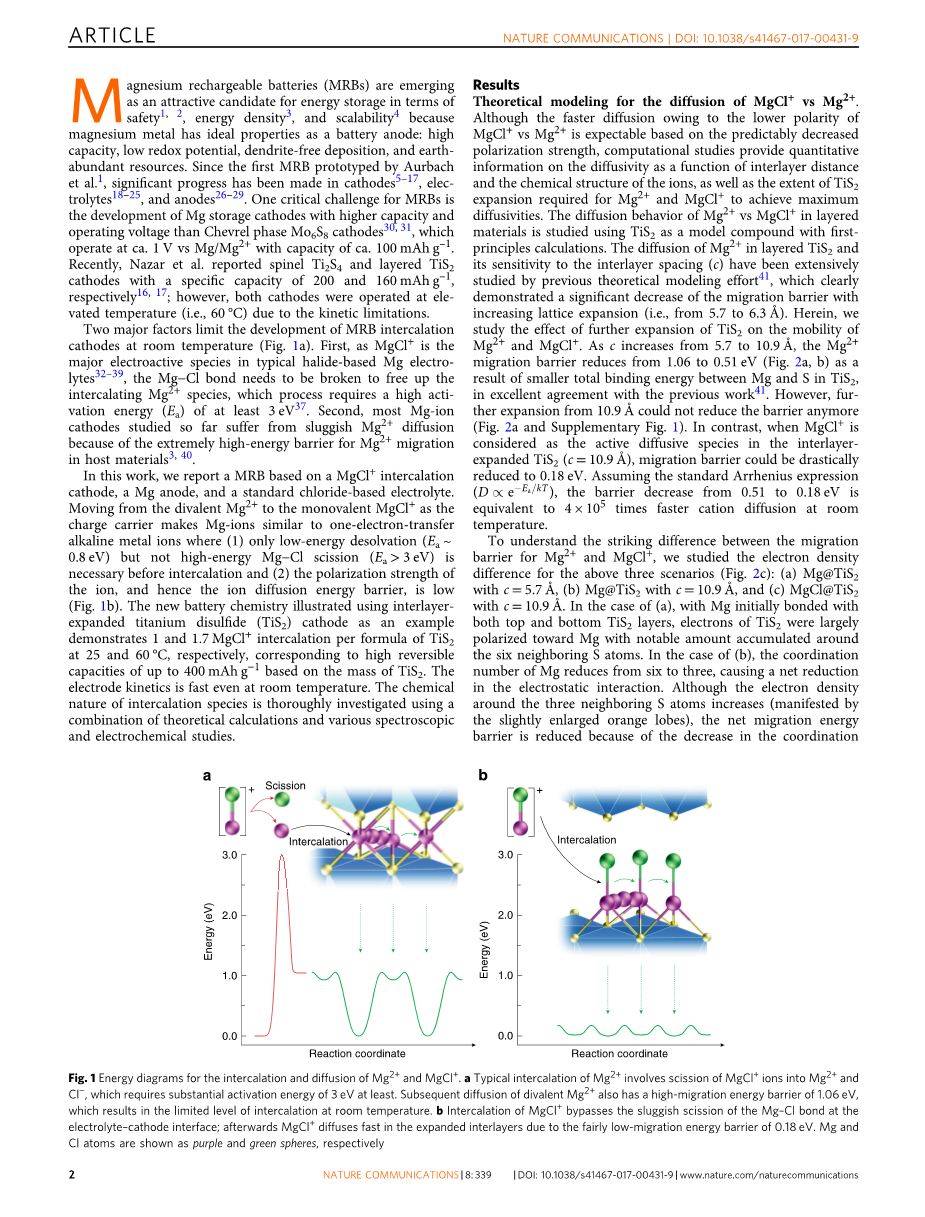 两个主要因素限制了室温下可充电镁离子电池插层正极的发展(图1a)。首先,由于MgCl 是典型的基于卤化物的镁电解质中的主要电活性物质,因此需要破坏Mg-Cl键以释放插入的Mg2 物质,该过程需要至少3eV的高活化能(Ea)。其次,迄今为止研究的大多数镁离子阴极都存在Mg2 扩散缓慢的问题,这是因为主体材料中Mg2 迁移具有极高的能量势垒。