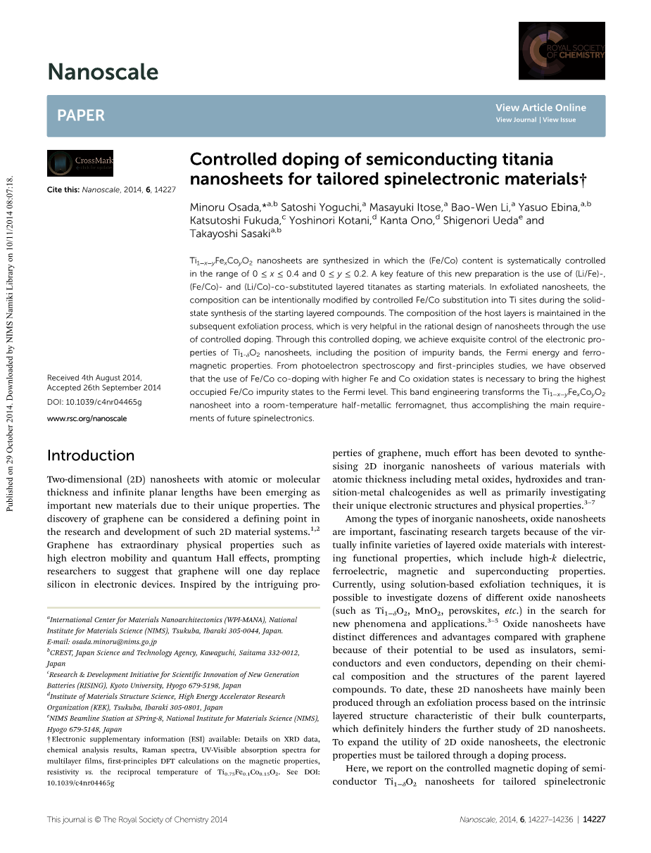 在本研究中,我们合成了Ti1-x-yFexCoyO2纳米片,其中(Fe/Co)含量被系统地控制在0le;xle;0.4和0le;yle;0.2的范围内。 这种新制法的一个关键特征是使用(Li/Fe)- ,(Li/Co) - 和(Fe/Co)- 取代的层状钛酸盐作为剥离纳米片中受控Fe/Co掺杂的起始材料。 在随后的剥离过程中保持主体层的组成,这对合理设计受控掺杂的纳二维米片具有重要的指导意义。通过控制掺杂,我们对Ti1-delta;O2纳米片的电子和铁磁性能进行了精确控制,并利用Ti1-x-yFexCoyO2纳米片成功开发了室温半金属铁磁体。