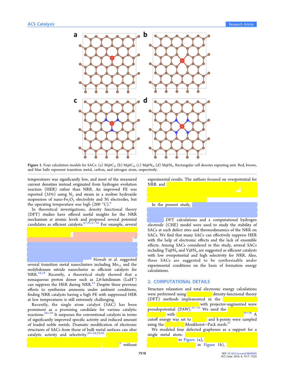 在本研究中,我们研究了NRR对锚定在含有碳空位和氮的缺陷石墨烯位点的单个过渡金属原子的催化活性。DFT计算和计算氢电极(CHE)模型用于研究SAC在每个缺陷位点的稳定性和NRR在SAC上的热力学。 我们发现许多SAC可以在电子效应的帮助和整体效应缺乏的情况下有效地抑制HER。在本研究考虑的SAC中,包括Ti@N4和V@N4的几种SAC被认为是对NRR具有低过电势和高选择性的有效催化剂。此外,这些SAC基于形成能计算表明可在实验条件下合成。