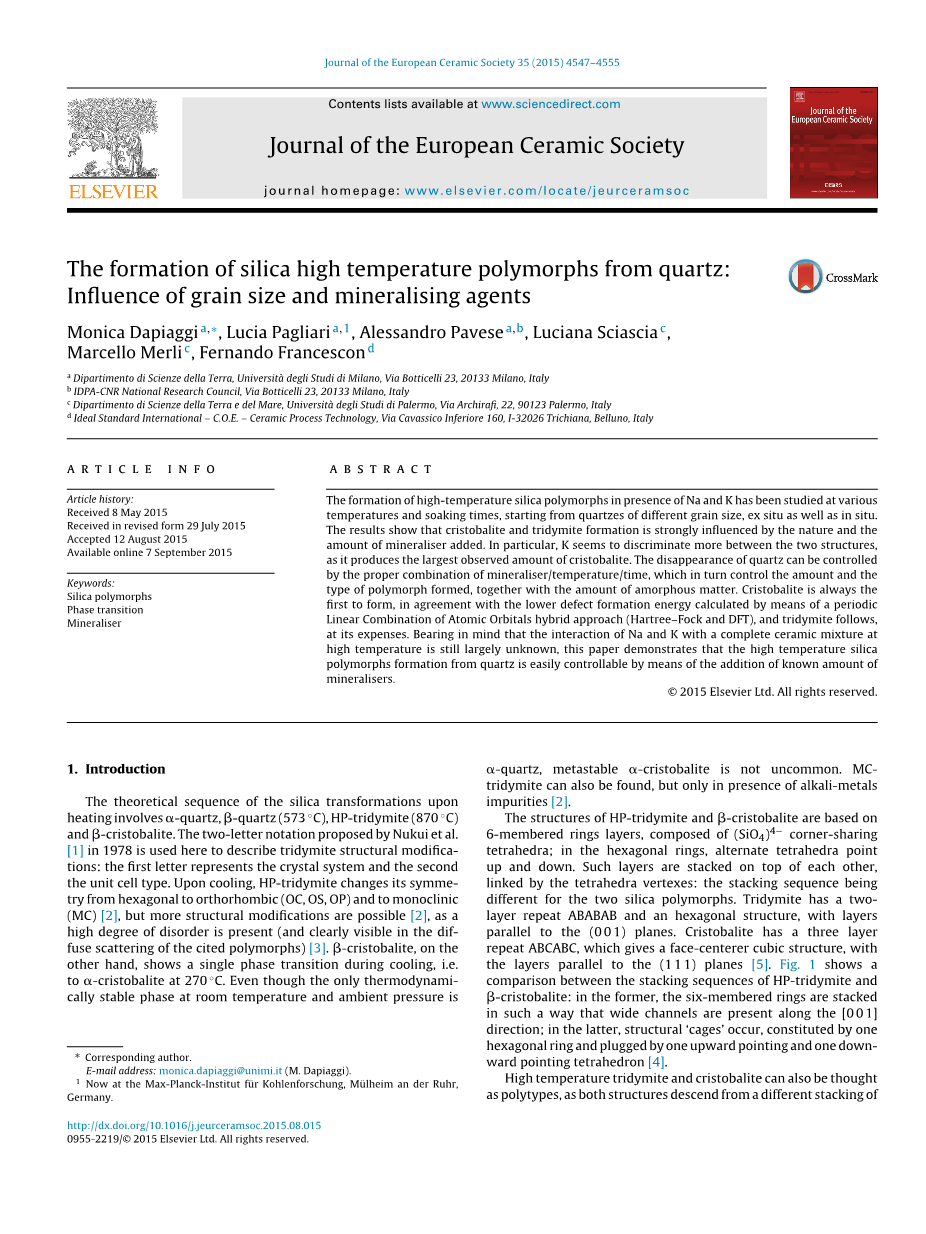 可以利用方石英和磷石英的形成来适当地“调整”陶瓷体的热膨胀系数,以使其与釉料相匹配,从而避免由于内部体积和表面之间的不匹配而出现裂纹。冷却后,beta;-方石英在270℃转变为四方alpha;相,因为alpha;-石英的重建转变在动力学上是缓慢的。alpha;-和beta;-方晶石分别具有 91.7和6x10-6℃平均堆积热膨胀值,这会影响冷却时的收缩,并对最终产品的质量产生影响。在热膨胀特性方面,磷石英在很大程度上仍然是未知的,Fei没有报道这种特性,或者据作者所知,尚未发表有关报道。本文主要研究方石英和磷石英从工业级石英形成的条件,作为粒度分布(PSD ),矿化剂(Na和K 羟基 )和时间/温度条件对陶瓷转化的影响。还通过原位高温X射线粉末衍射研究了反应机理,使用实验室设备或同步辐射。磷石英的体积热膨胀值是本文的一个有趣的副产品。量子力学计算(基于Hartree-Fock和DFT的原子轨道混合方法的周期线性组合)在此用作补充技术,以帮助理解两种高温多晶体对 Na/ K的掺入。
