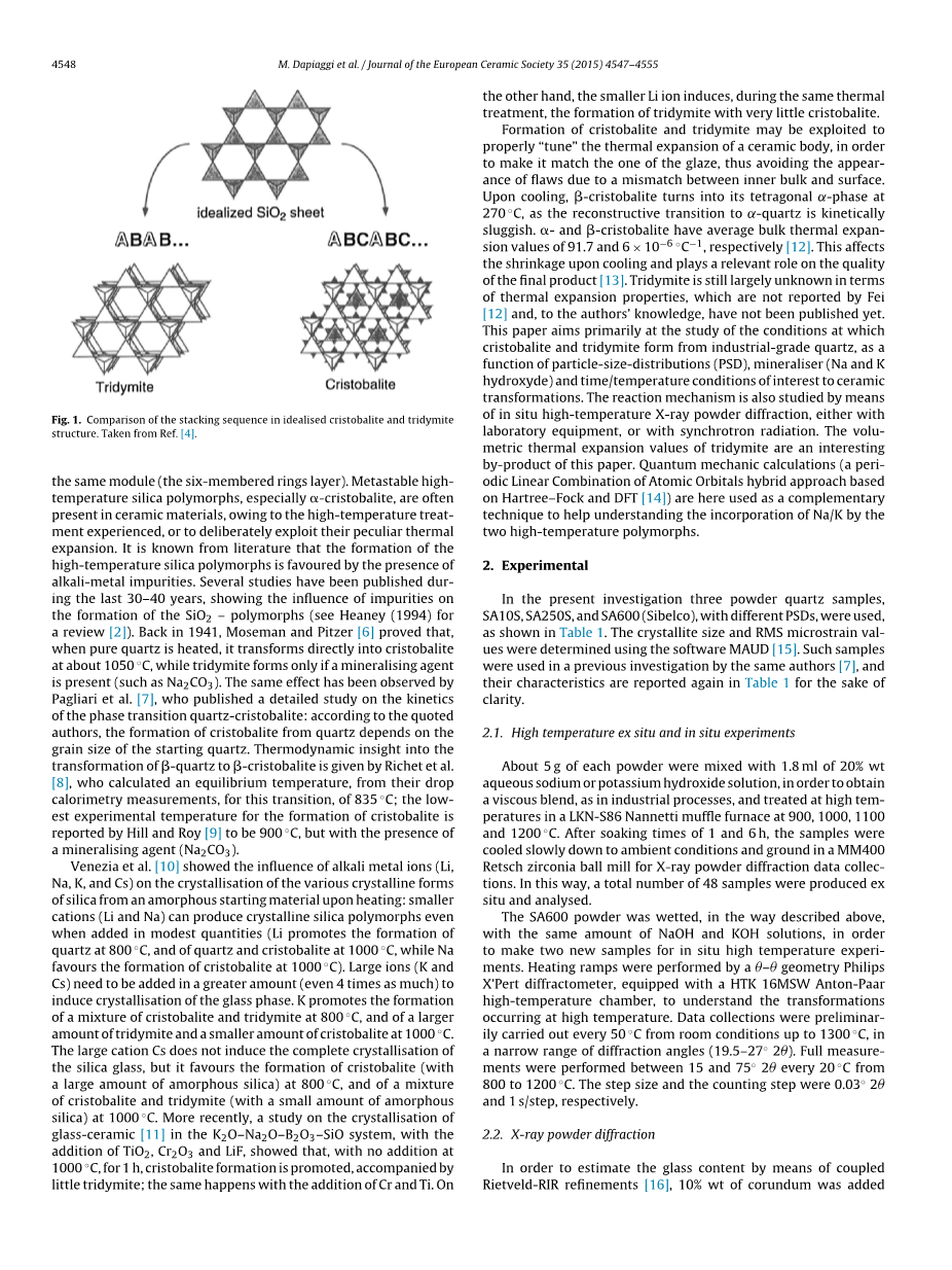 高温磷石英和方石英也可以被认为是多晶体,因为两种结构都来自相同模块(六元环层)的不同堆叠。由于经历了高温处理或利用其特有的热膨胀性,亚稳态高温二氧化硅多晶体,尤其是alpha;-方石英,经常存在于陶瓷材料中。从文献中已知,碱金属杂质的存在有利于形成高温二氧化硅多晶体。在过去的30-40年间,已经发表了几项研究,显示了杂质对SiO2多晶体形成的影响。早在1941年,Moseman和Pitzer证明,当纯石英被加热时,约1050℃直接转变成方石英,而只有在存在矿化剂(如Na2C03)时才形成磷石英。Pagliari等人观察到了相同的效果并发表了关于相变石英-方石英动力学的详细研究:根据被引用作者的理论,石英中方石英的形成取决于起始石英的晶粒尺寸。Richet等人给出了beta;-石英转变为beta;-方石英的热力学观点,他们从它们能够转变的最大温差处测量计算出平衡温度,这个转变温度为835℃;Hill和Roy报道了存在矿化剂(Na2C03 )时方石英形成的最低实验温度为900℃。