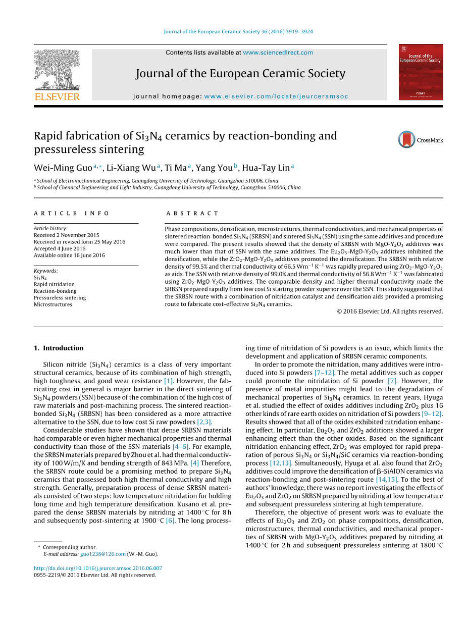 通过反应键合和无压烧结快速制备Si3N4陶瓷