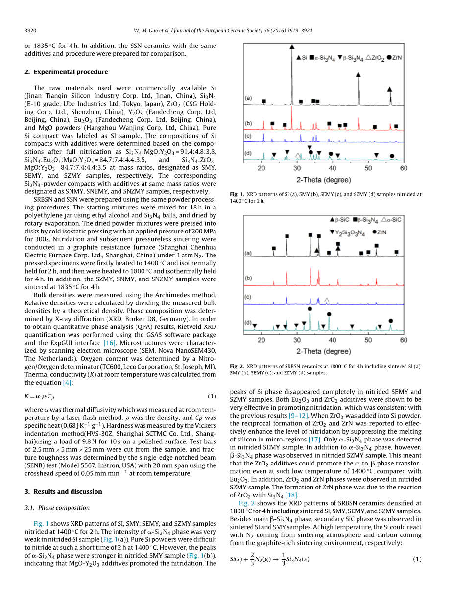 2.实验过程:使用的原料是市售的Si(济南天勤硅业有限公司,济南,中国),Si3N4(E-10级,Ube Industries Ltd,日本东京),ZrO2(CSG Holding Corp. Ltd.,Shenzhen,China) ),Y2O3(Fandecheng Corp. Ltd,北京,中国),Eu2O3(Fandecheng Corp. Ltd,北京,中国)和MgO粉末(杭州万景有限公司,中国)。 将纯Si压块标记为SI样品。 具有添加剂的Si压块的组成基于完全氮化后的组成确定为Si3N4:MgO:Y2O3= 91.4:4.8:3.8,Si3N4:Eu2O3:MgO:Y2O3= 84.7:7.4:4.4:3.5,和Si3N4:ZrO2: MgO:Y2O3 = 84.7:7.4:4.4:3.5质量比,分别表示为SMY,SEMY和SZMY样品。 将具有相同质量比的添加剂的相应Si3N4粉末压块分别指定为SNMY,SNEMY和SNZMY样品。