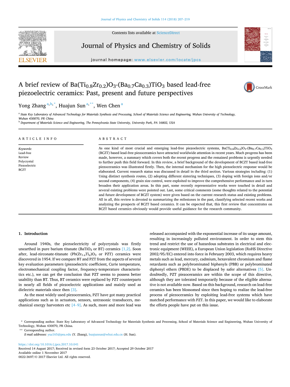 Ba (Ti0.8Zr0.2O)3(Ba -0.7CA0.3TiO)3(BCTZ) 基无铅压电陶瓷作为一种新兴和最紧俏的无铅压电系统,吸引了全世界的关注并且已经取得了很大进展。该摘要覆盖了最近的进展及存在问题,以进一步推动这一领域向前发展。且就BCTZ 基无铅压电陶瓷简要的历史发展背景进行说明,并且对内部机构的压电响应性进行详细阐述。在第三部分中对当前的研究现状进行了详细讨论。包括:(1) 使用不同的合成路线(2)采用不同烧结技术 (3) 掺杂杂质离子和 / 或第二构成 (4) 用于改进性能并拓宽其应用领域的颗粒尺寸控制。在这个部分就最近一些代表性作品进行分析接触并指出几个细节存在的问题。最后则说明了(思考与未来发展的潜力和 BCTZ) 系统技术的研究现状和存在问题。总之,本文是在对过去的里程碑的总结,分析了最近BCTZ 基陶瓷选择分类的前景。希望该篇概述对于BCTZ 基陶瓷的着重描述可以对其研究群体提供有用的引导方向。