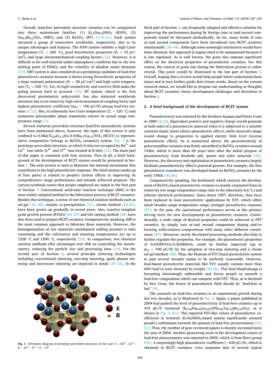 上面已经提到了几种主要的钙钛矿结构无铅压电系统,然而,本综述的主题仅限于0.5Ba(Ti0.8Zr0.2)O3-0.5(Ba0.7Ca0.3)TiO3(BCZT)(a代表性成分属于BaTiO3陶瓷)体系。图1是原型钙钛矿结构,其中A位置被Ba2 和Ca2 离子占据,而Zr4 和Ti4 离子位于B位。本文的主要部分包括四个部分。首先,第1节将介绍BCZT系统发展的简要背景。下一部分用于说明有助于高压电响应的内部机制。第三部分(由四部分组成)与人们在提高综合使用性能方面的不懈努力有关,并已取得进展。人们使用的各种合成路线在第3节的第一部分中说明。传统的固态反应技术(SSR)是BCZT陶瓷制造过程中应用最广泛的方法。除了这种技术,近年来逐渐成长起来还有一系列湿化学溶液方法,如溶胶 - 凝胶,草酸盐共沉淀,柠檬酸盐法。此外,反应性模板晶粒生长过程(RTGG)和凝胶浇铸方法也已用于制备BCZT陶瓷。相比较而言,SSR是制造这些材料的最常用方法。但是,均质化原料(机械研磨工艺)耗时,煅烧和烧结温度分别高达1250℃和1500℃ensp;。相比之下,湿法化学溶液方法在控制化学计量,减小粒径和处理时间方面优于SSR。在第3节的第二部分,详细描述了几种主要的烧结技术,包括常规烧结,两步烧结,放电等离子烧结和微波烧结。在第3节的第三部分中,将有条不紊地讨论一种经常采用的有效解决方案,用于改善外来离子或/和第二组分的性能掺杂。到目前为止,有意地将多种离子或/和第二组分引入BCZT陶瓷。虽然已经获得了一些看似令人满意的结果,但这种方法迫切需要进行总结,因为它的监管较少。众所周知,晶粒尺寸对压电陶瓷的电性能有很大影响。因此,在制造过程中控制晶粒尺寸是至关重要的。这一点将在第3节的最后部分中说明。总的来说,希望概述能够帮助人们更好地理解这些问题,从而进一步指导他们未来的工作。根据目前的研究状况,我们想在第4节中提出我们对BCZT陶瓷未来发展挑战和方向的理解或思考。