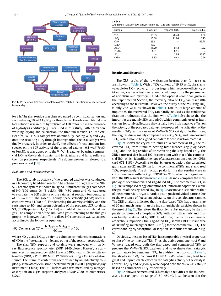 其中NOinlet和NOoutlet分别指反应器入口和出口处的流体气体中NO的体积(摩尔)浓度。 用X射线荧光光谱仪(XRF,S4-Explorer,Bruker)、扫描电子显微镜(SEM,日立S4800)和使用CuKalpha;辐射源的X射线衍射仪(XRD, X#39;Pert PRO MPD, PANalytical)分析炉渣、TiO2载体和催化剂。钛含量通过电感耦合等离子体原子发射光谱仪(ICP-2000,江苏天瑞仪器,中国)测定。BET表面积通过气体吸附分析仪测定(ASAP 2020,Micromeritics,美国)。
