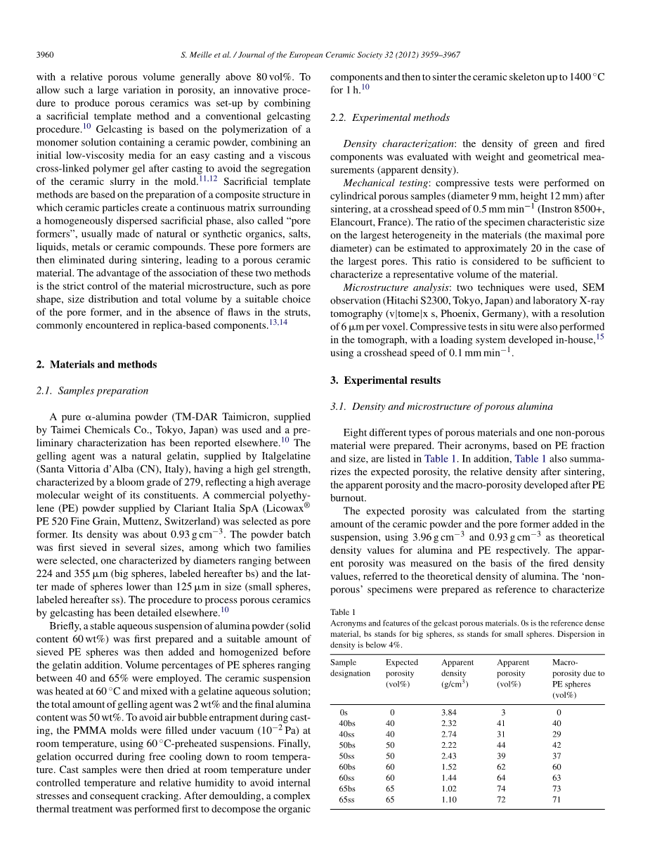 本研究的目的是研究多孔陶瓷在一定孔隙度范围内的力学行为,试图在孔隙率通常小于40%的多孔陶瓷与相对多孔体积在80%以上的多孔陶瓷之间架起桥梁。为了允许如此大的孔隙度变化,一种创新的方法以陶瓷粉末单体溶液聚合为基础,结合普通模板法,建立了制备多孔陶瓷的方法。将容易铸造的初始低粘度介质与铸造后的粘性交联聚合物凝胶相结合,以避免陶瓷浆料在普通模板法中的偏析,其基础是制备一种复合结构,其中陶瓷颗粒形成一个连续的基体,围绕一个分散相,也称为“孔隙相”,通常由天然或合成的相组成,盐、液体、金属或陶瓷化合物。然后在烧结过程中消除这些孔隙,形成多孔陶瓷材料。这两种方法结合在一起的优点是严格控制材料的微观结构,如孔型、尺寸分布和总体积等,通过合适的孔型选择,在无缺陷的情况下,在粉末冶金中普遍遇到。