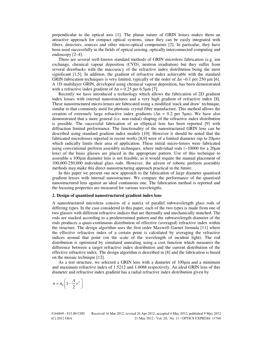 最近,我们采用了一种技术,它允许制造具有内部纳米结构和非常高的折射率梯度的二维梯度折射率透镜[8]。这些纳米结构的微透镜是使用一种改进的“堆叠和拉伸”技术制造的,类似于通常用于制造光子晶体光纤的技术。此方法能够产生极大的折射率梯度(∆n=0.2/5micro;m)。我们还证明了折射率分布的更一般的(即非径向)成形是可能的,记录了一种具有衍射极限性能的椭圆透镜的成功制造 [9]。纳米结构GRIN透镜的功能可以用标准梯度指数模型[10]来描述。然而,应该指出的是,在最近的研究工作[8,9]中所报道的制作的微透镜的直径是有限的(最多20micro;m),这从根本上限制了它们的应用范围。这些最初的微透镜是使用传统的预成型组装技术制造的,其中基础玻璃的单个棒(20micro;m透镜约为10000个)被放置在适当的模板中。使用这种技术组装直径为100micro;m的透镜是不可行的,因为它需要人工放100000-250 000个单独的玻璃棒。然而,机器人组装预制块方法的出现可能会使这种直接制造纳米结构方法在未来变得实用。