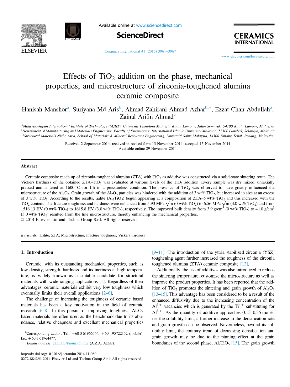 通过固态烧结法制备由氧化锆增韧氧化铝(ZTA)和添加剂TiO2组成的陶瓷复合材料。检测具有不同TiO2含量的ZTA-TiO2复合材料的维氏硬度。将样品进行干混、单轴压制,然后无压烧结1小时(1600℃)。实验结果表明,TiO2对Al2O3的微观结构有很大影响。当TiO2添加至3wt%时,Al2O3颗粒的晶粒生长受到阻碍;但当TiO2超过3wt%时,晶粒尺寸增加。研究表明,当TiO2添加至5wt%时,铝假板钛矿(Al2TiO5)开始产生,并随着TiO2含量的增加而增加。在TiO2的添加过程中,复合材料的断裂韧性和硬度分别从5.93MPa·m(0wt%TiO2)增加到6.56MPa·m(3.0wt%TiO2),从1516.13HV(0wt%TiO2)到1615.8HV(3.0wt%TiO2)。同时微观结构更精细,使得堆积密度从3.9g/cm3(0wt%TiO2)增加到4.10g/cm3(3.0wt%TiO2),提高了机械性能。