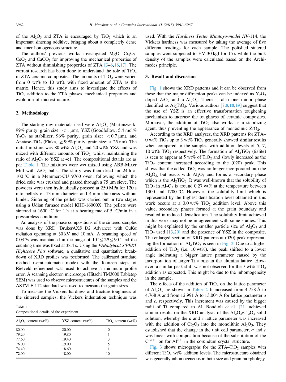 为改善ZTA的力学性能而不减弱其他性能[3-6,16,17],以往研究中使用了添加剂MgO、Cr2O3,、CeO2和CaCO3。目前已完成关于TiO2在ZTA陶瓷复合材料中的作用的研究。实验以定量ZTA作基质,TiO2含量在0wt%和10wt%之间。因此,本文研究了TiO2对ZTA的力学性能和微观结构的影响。
