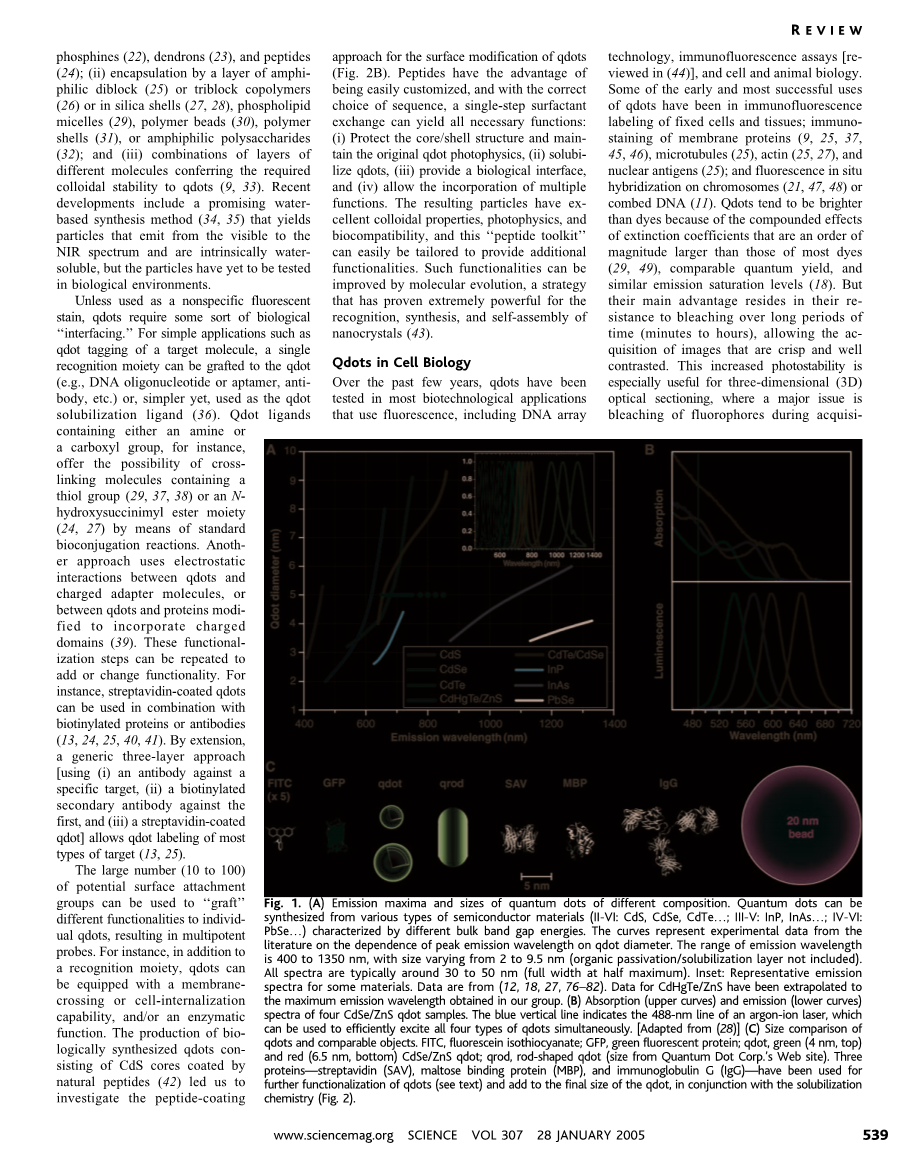 很多蛋白的表面接触基团(10到100种)可以把一些功能“移植”到独立的量子点上,使其成为很优秀的探测器。例如,增加识别部分可以让量子点具有穿过细胞膜(或细胞内化)的能力与酶催化功能。通过生物方法合成的,由多肽包裹CdS核构成的量子点材料的诞生引领我们去探究通过包裹多肽来对量子点材料进行表面改良的方法。多肽拥有易于定制的优点,只要单体排列选择正确,只要进行一步表面活性修改就能产生很多必要的功能,如1保护核从而让其保持量子点的物理发光能力2让量子点可溶3,提供一个生物相容的表面,这些使得很多功能能够复合。这样处理后的材料颗粒有胶体的特性,有物理发光能力,还拥有生物相容性,这种“多肽工具包”能轻松按照需求提供额外的功能,这些功能可以通过分子技术的革新提高,这类技术现在很好的完成了纳米晶的识别,合成以及自组装。